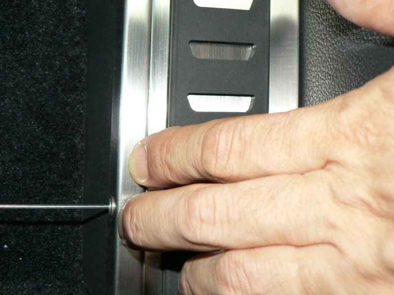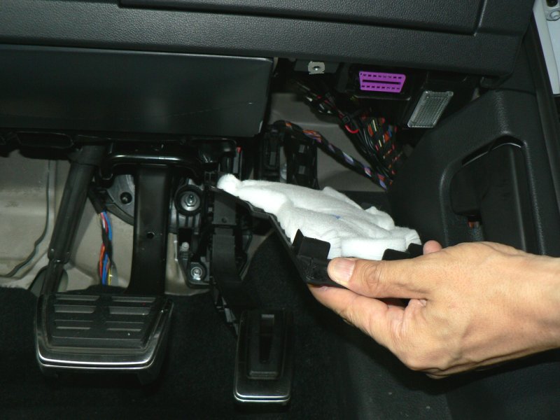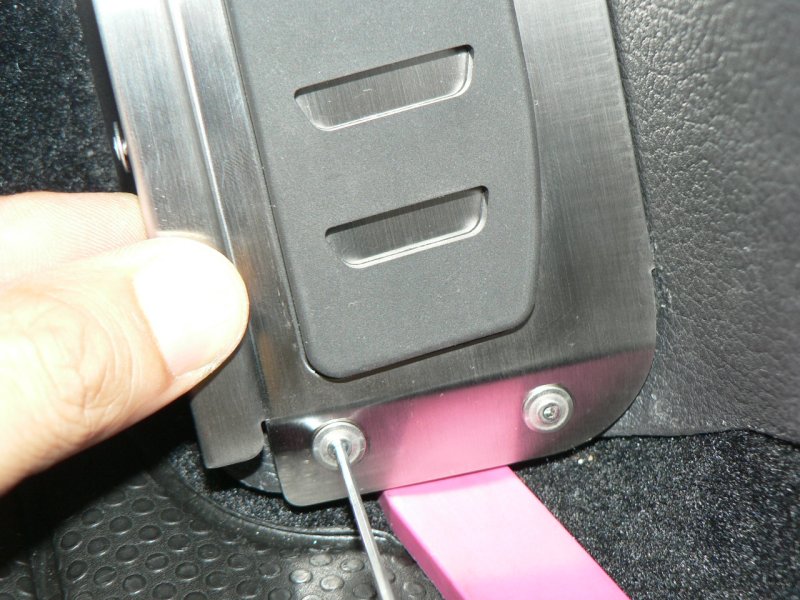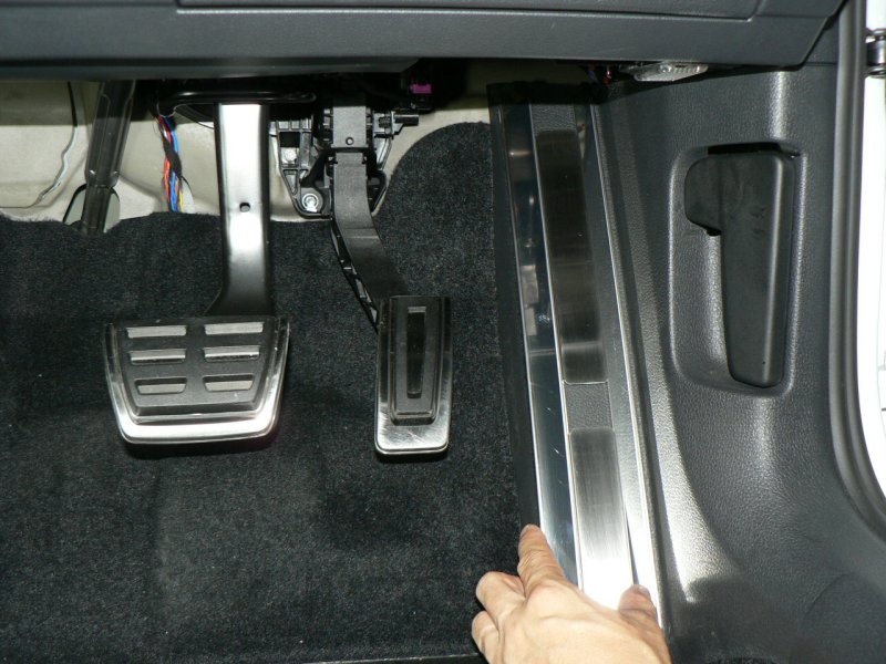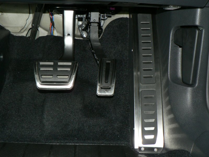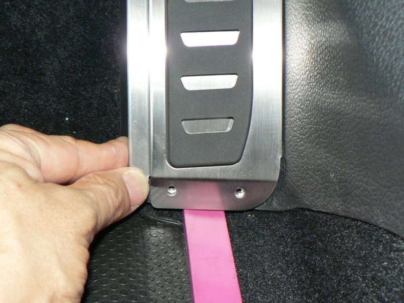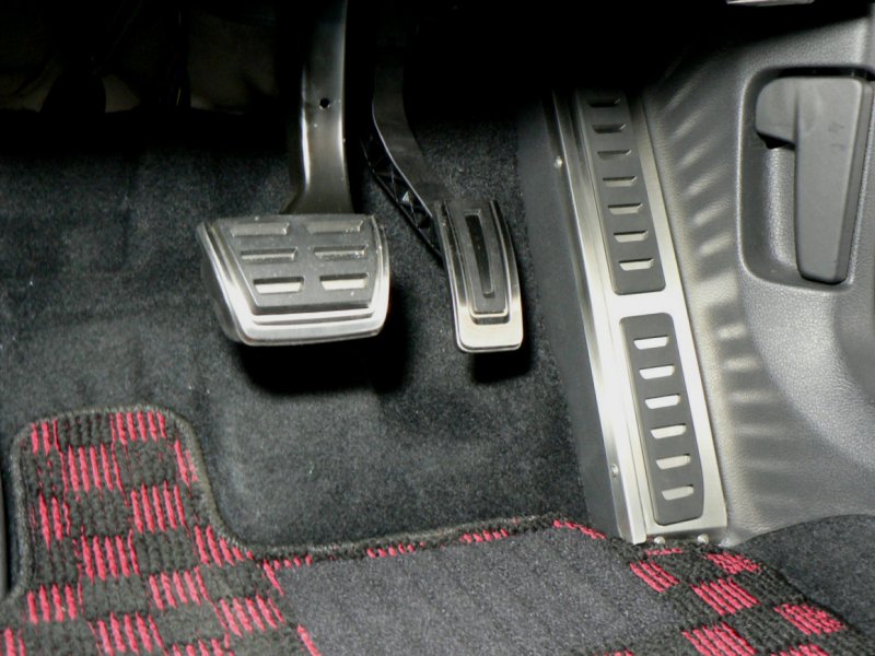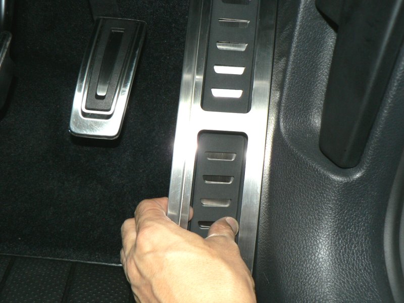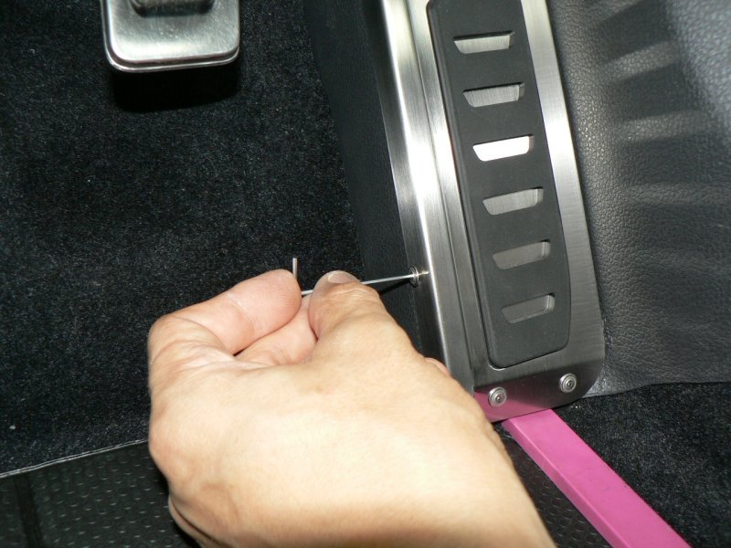 左写真は車両(GTI)のノーマル状態です。ステンレス製の凝ったデザインのアクセル、ブレーキペダルに比較して、右側のキックパネルは寂しい感じです。この商品は、そんな右側キックパネルの中途半端さを綺麗に解消し、お洒落に、かつ実用的にチューンアップする商品です。では、さっそくその装着方法をご紹介しましょう。単に装着するというのではなく、工房長ならではの「ビシッと装着するコツ」を惜しみなく伝授いたします。