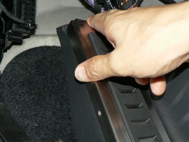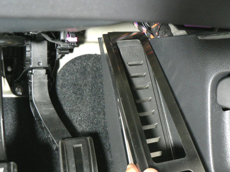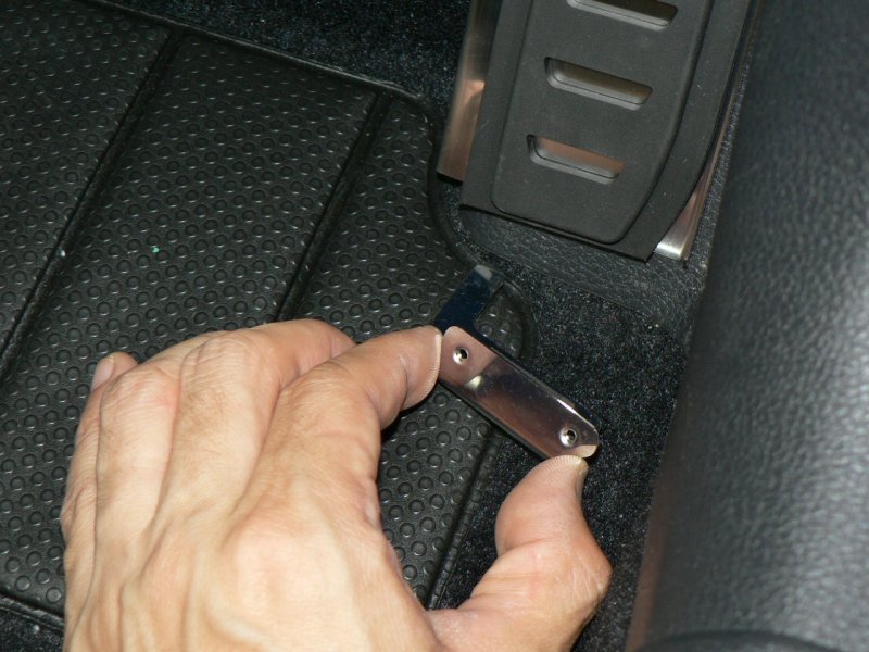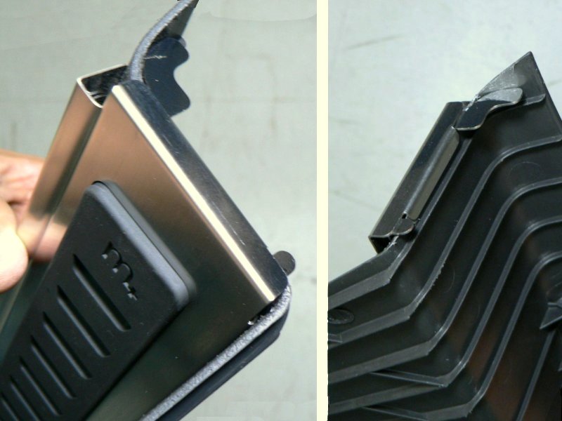 以上の準備ができたら、最初に本商品のベースプレートを車両のキックパネルに引っ掛けます。折り曲げのベロがある方が上です。次に、そのベースプレートにラバーを引っ掛けます。m+のロゴが上です。ラバーの彫り込みがベースプレートの出っ張りに嵌りますので、難なく引っ掛かるはずです。それからブラケットをキックパネルの下に滑り込ませます。ベロの出っ張っている方を左にして差し入れます。差し入れる箇所は、キックパネルの下端とフロアの内装カーペットの間です。隙間なく密着して見えますが、カーペットが柔軟ですので、ブラケットの薄板は難なく差し込むことができます。ブラケットの折り曲げがキックパネルの下端の位置にくるまで(つまり、つっかえるまで)、差し込んでください。