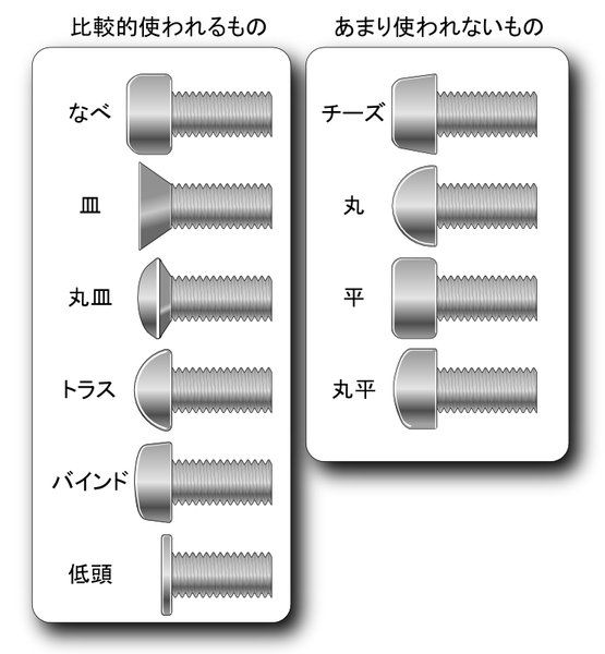 工房長です。先日の開発記で「ネジ頭の形状とばか穴の直径についても作業性や固定強度へのこだわりがあります」という記述について、「具体的にどのような内容でしょうか」というお問い合わせをいただきましたので、その「こだわり」を少しご紹介いたします。まず、ネジ頭は大別すると、なべ頭やトラス頭のように座面がフラットなものと、皿頭や丸皿頭のように座面がテーパー(円錐状)になっているものと、2種類があります。皿ネジを使う場合は、被締結物のネジ穴に皿モミと言われるテーパ(円錐状)のザグリを施して、ネジの座面が被締結物にフィットするようにして使用します。