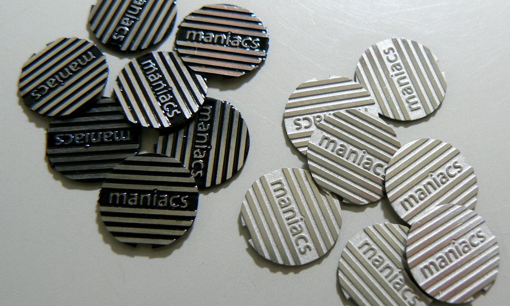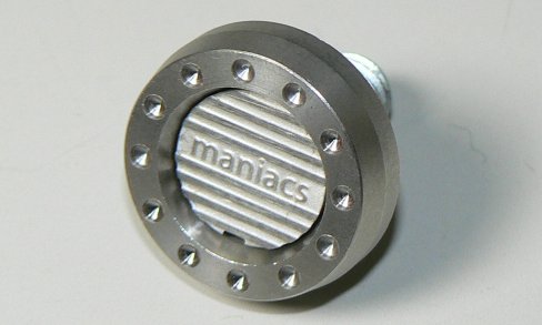 直径12mmの中にドイツの国旗カラーとDのマークをアシンメトリに配置した精緻なデザインで、maniacsのお家芸とも言える発色性に優れたシルク印刷で丁寧に製作しています。表面はクリア樹脂でコーティングして、もっちりとした高級感のある仕上がりです。ラウンドシェイプの優しいデザインのボルト本体と絶妙のマッチングで、メカメカしくなりすぎない、温かみを感じる仕上がりになっています。こちらもボルト本体はブラックとベアの2種類を用意し、ボディカラーやモディファイの雰囲気に合わせてお選びいただけます。