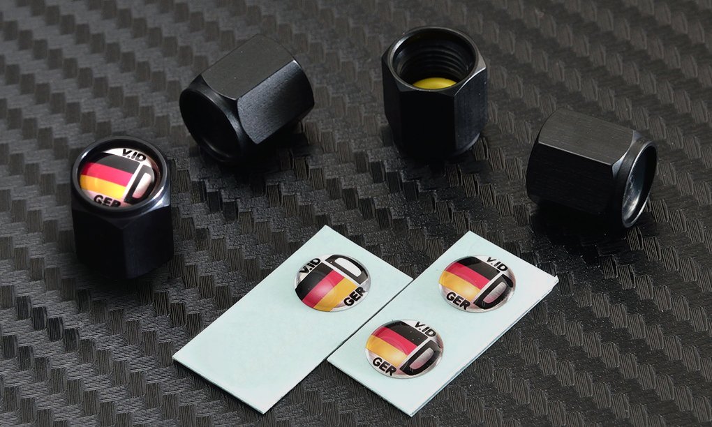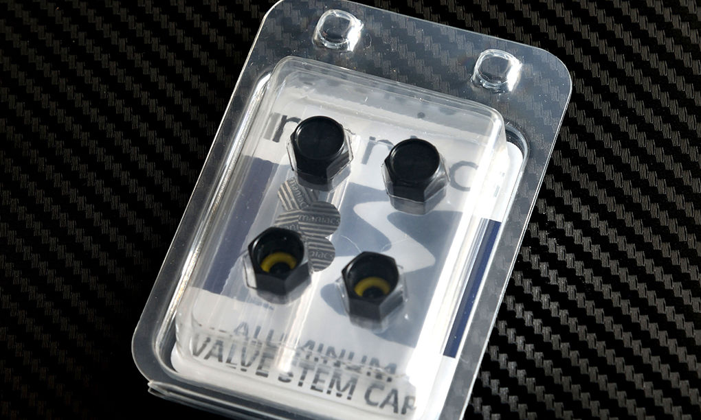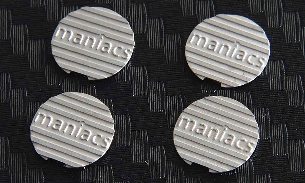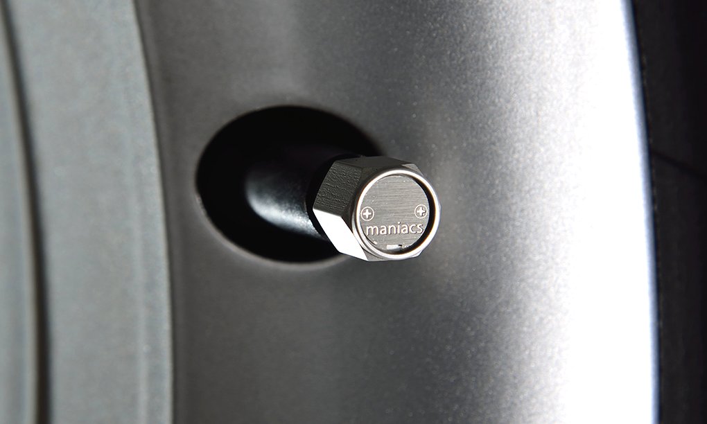 プレーンタイプは、maniacsライセンスプレートスタッドのプレーンタイプと共通性のあるデザインです。全種類とも、デザインプレートは後貼り形式ですので、エアバルブにキャップを丁度よく締めた状態で、プレートを所望の向きに貼ることができ、4本のホイールが揃って綺麗に納まります。