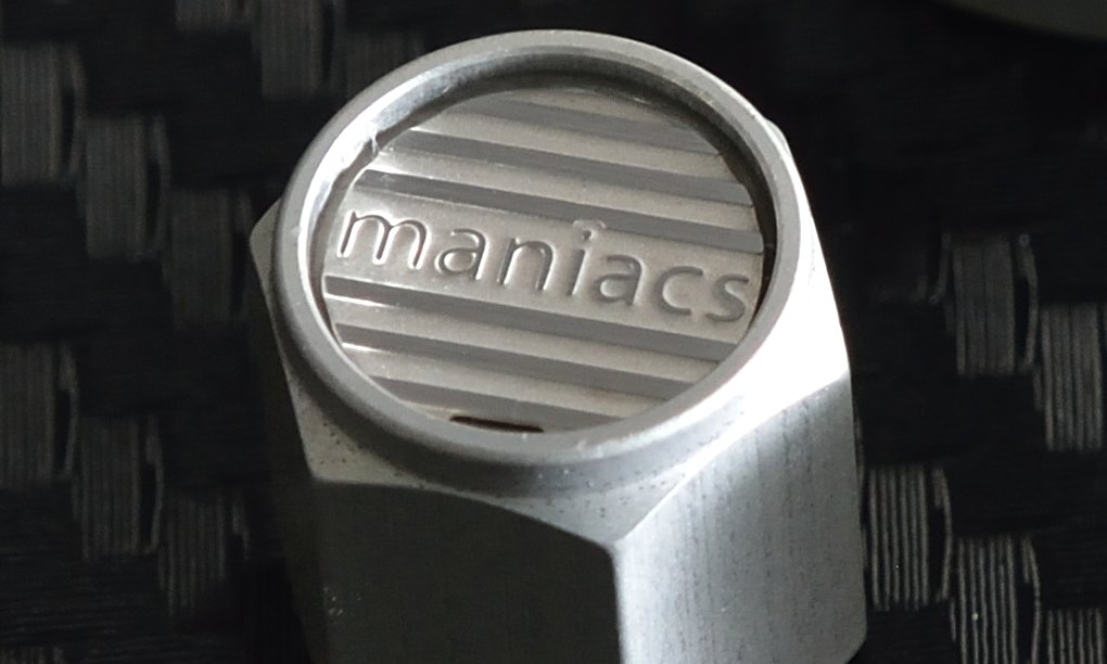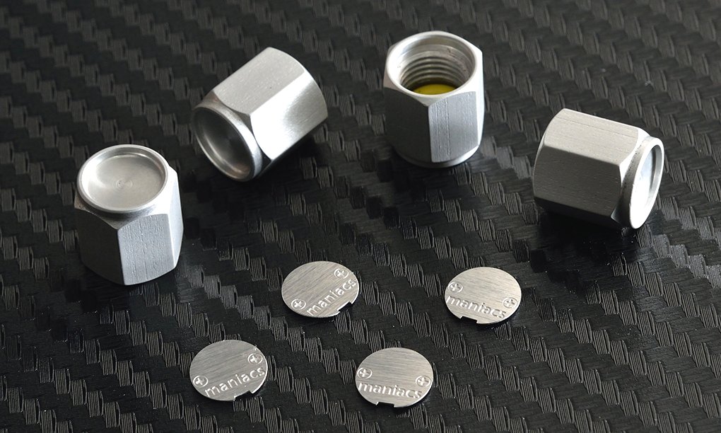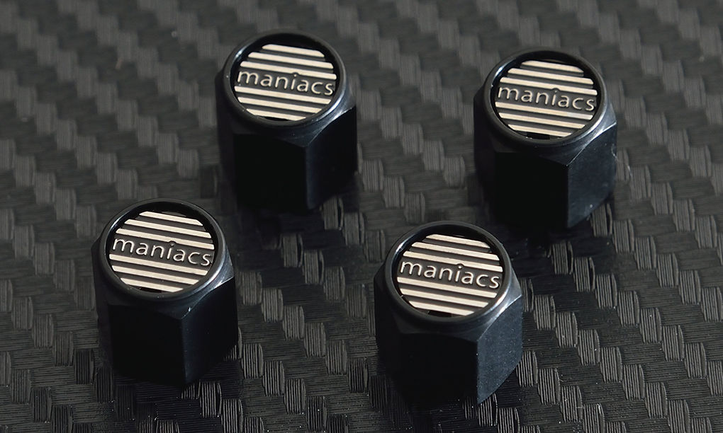 工房長です。密かに開発を進めていましたエアバルブキャップを、突然の新発売です。好評いただいておりますmaniacsライセンスプレートスタッドとコーディネートできるデザインで、3タイプ、カラーバリエーションを含めて全5種類のラインナップを一気に発売いたします。