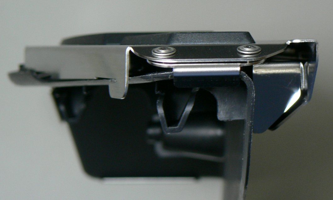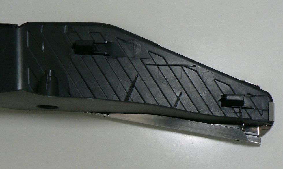 そしてノーマルフットレストの3つ目の欠点は、踏面の形状です。上部の幅は十分に広いのですが、下部に向かって幅が狭くなる、逆三角(?)のような形状。拇指球のあたりに比較して踵の安定感が不足し、とくにソールの薄い靴のときなどは不自然な踏み心地になります。上部の幅はノーマルを維持すれば十分でそれ以上広げる必要はなく、下部の幅を補ってやることで、人間の足型に近い理想的な踏面が得られます。左写真はノーマルフットレストとの踏面形状の比較、右写真はノーマルフットレストに装着した状態を裏面から見たものです。下部に向かって幅を増しているのが分かると思います。