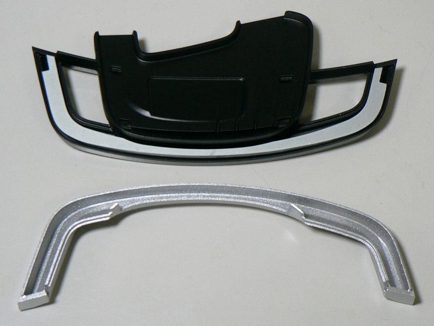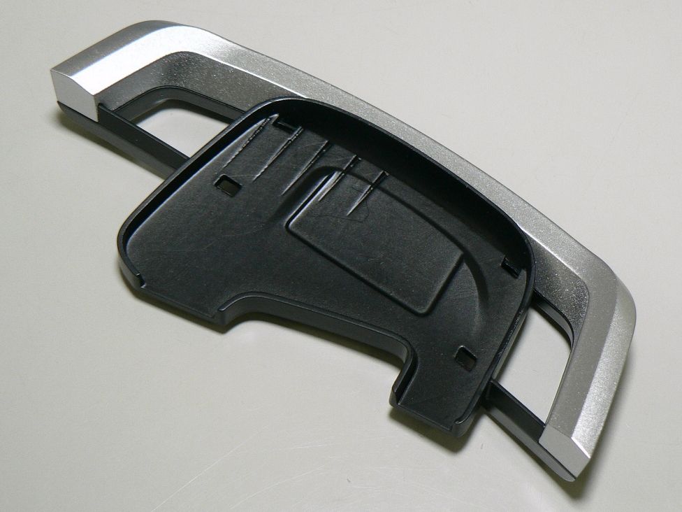 試作パーツが4ピースありありますが、4つ目の部品は実はオプションの「ハニカム・インレイ」です。っと言いつつ、結論から申しますとこのオプションは構想〜試作まででボツになりました(苦笑)。後付けでカチャリと嵌る装着構造も上手くいったのですが、若干クドイ感じかなと。これを採り入れると製品化に向けての調整項目が増えて発売が遅れる可能性もあり、残念ながら不採用。製品化の影には、けっこうイイ線いってるけどもう一息でボツになる無数のアイディアが存在する、という一例でした。