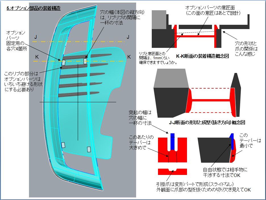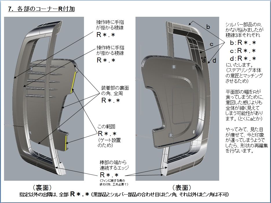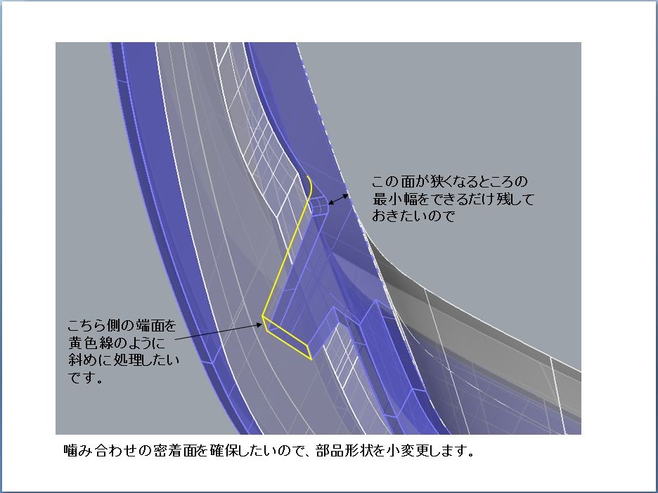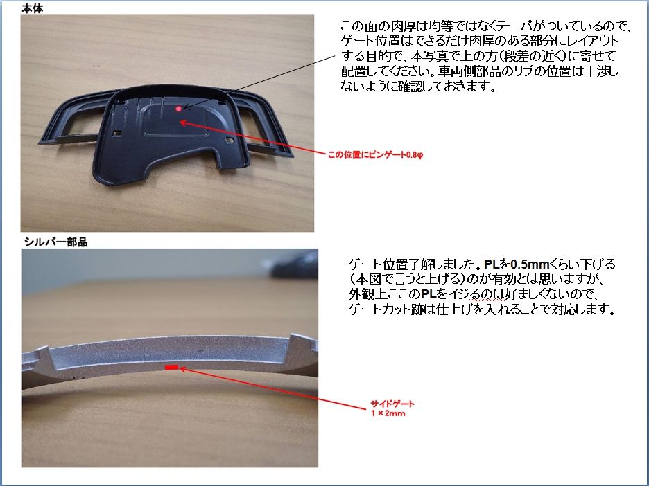 っと悦に入っているわけにはいきません。製品化に向けた細かい詰めの作業が、まだまだ山ほどあります。左のスライドはその一例ですが、裏面のリブ状のデザインの裏側、つまり両面テープを貼る面の形状です。外観面ではないのですが、こういう部分の細かな形状をしっかり詰めるかどうかで、量産時の製造品質が違ってきます。真ん中のスライドも組み立ててしまうと見えなくなる部分です。こういうところも妥協なく詰めていきます。そして右のスライドで成型の射出ゲート位置を決めています。
