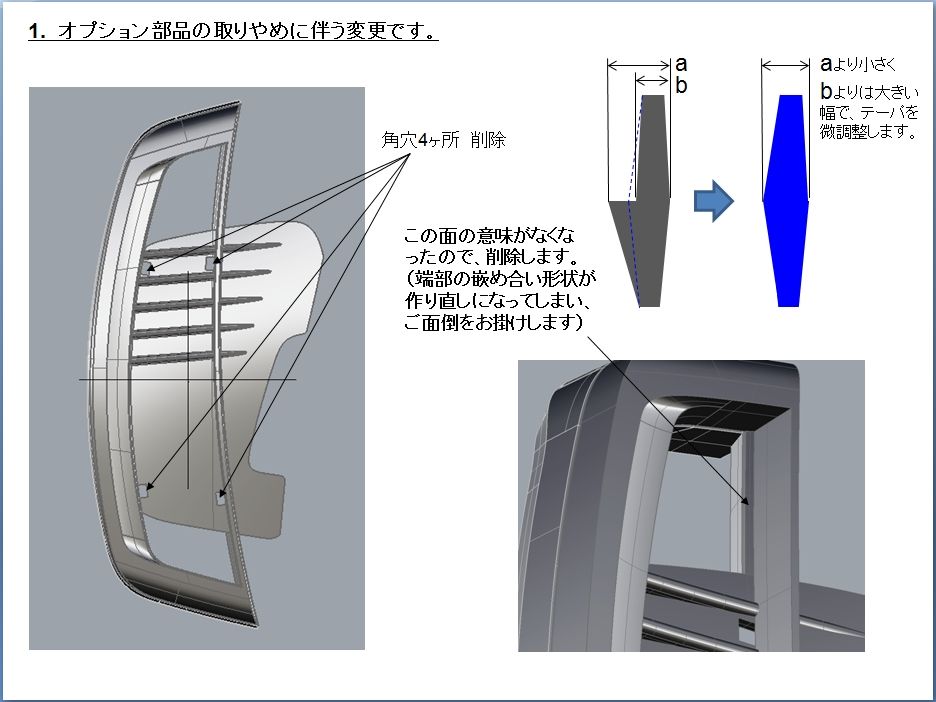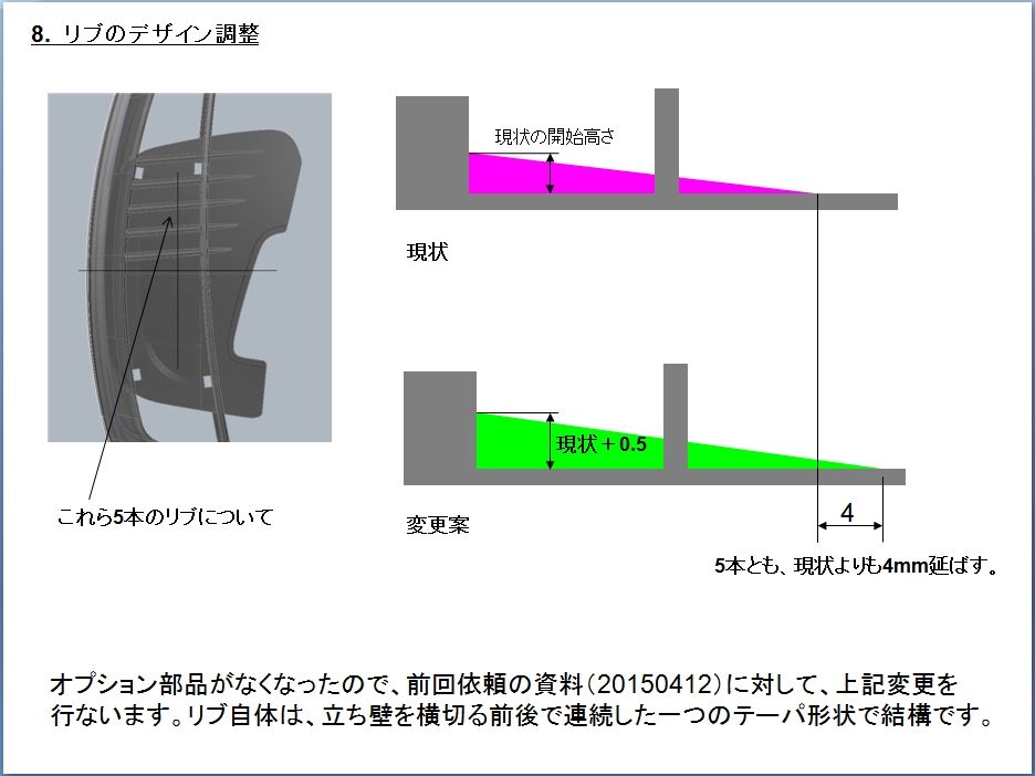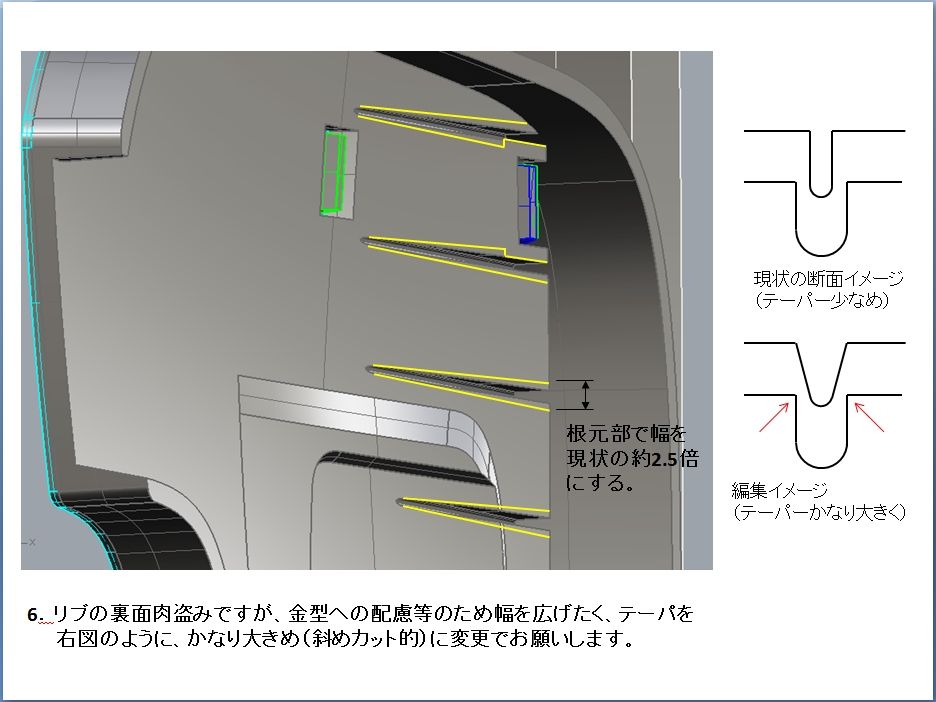 製品化に向けてのデザインの仕上げとは、例えば左スライドではボツになったオプション部品のために仕込んだフィン形状の段差を消してフィンの断面形状を再構成しています。真ん中のスライドでは、各部の角の丸み(Rと言います)を指定しています(ノウハウなので、数値情報は伏せています)。右のスライドでは、裏面のリブの形状を微調整しています。他にも諸々。そうして、ようやく製品版の設計が確定。いよいよ金型の製作にGO!を掛けます。もう後戻りは許されません。(つづく)