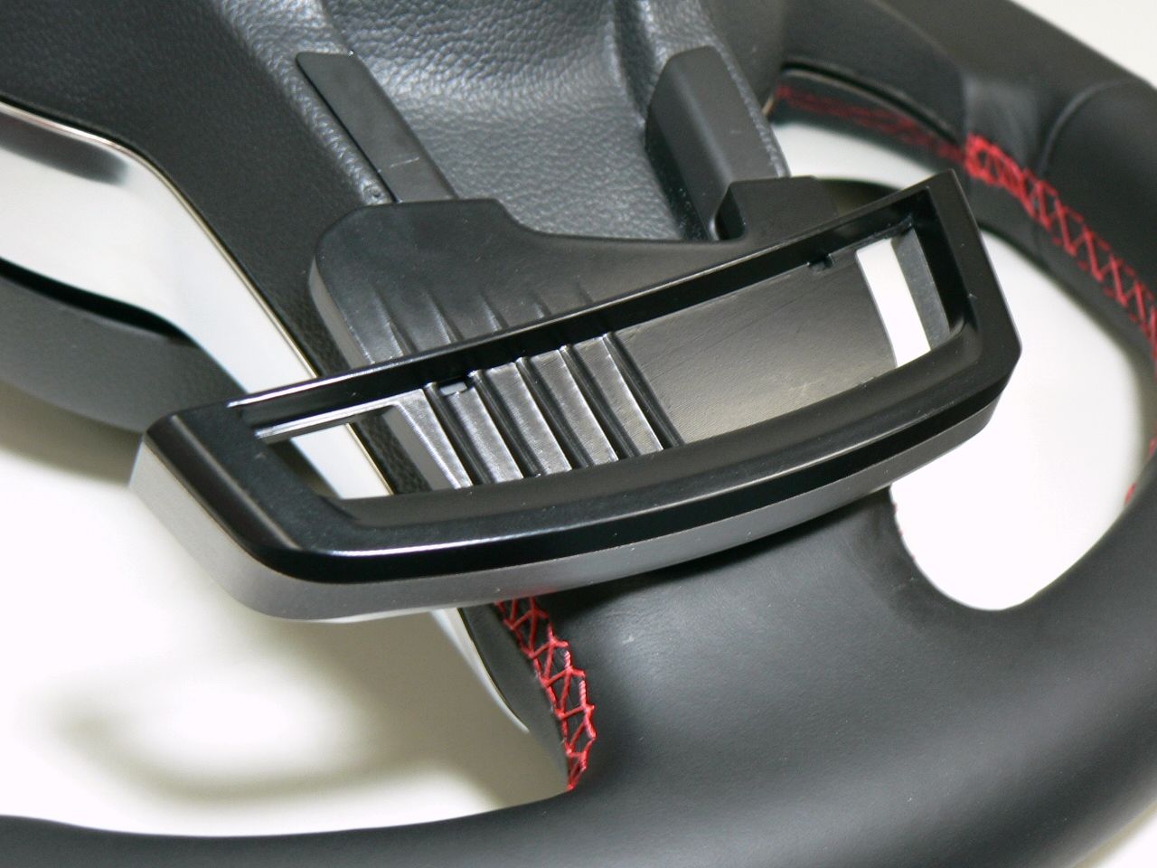 実際にステアリングに装着し、それから車両にも装着して評価しました。外観のマッチングは狙い通りで申し分ありません。シルバーの棒状の力強い陰影がステアリングスポークの枠ぶちと絶妙に融和。そして奥行き方向に段違いになった縦捻じれと横捻じれのような関係が独特の立体感を醸し出しています。裏面から見てもしっかりとGolf7世代を感じさせる隙のなさ。作者自身の期待をも超える印象の良さです(笑)。雑誌等に紹介していただいた写真も、実はこの2次試作品です。