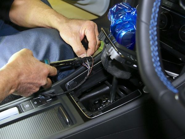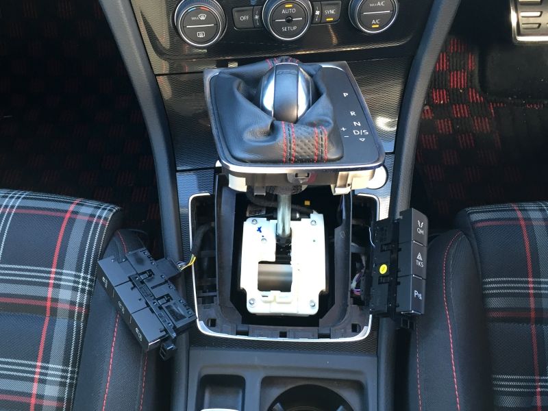 左側のコンソールスイッチの配線に接続した茶・灰のスモール電源線は、シフトノブの前方に引き回して、maniacs 4D Console Decorative Switch for Golf7(Type B)の裏面配線(さきほど分離した半透明のカプラ)と接続します。カプラは単純に挿し込めばロックが掛かります、ロックの爪が掛かったことを目視で確認してください。これで、Type Bスモール連動の白色イルミネーションが点灯します。