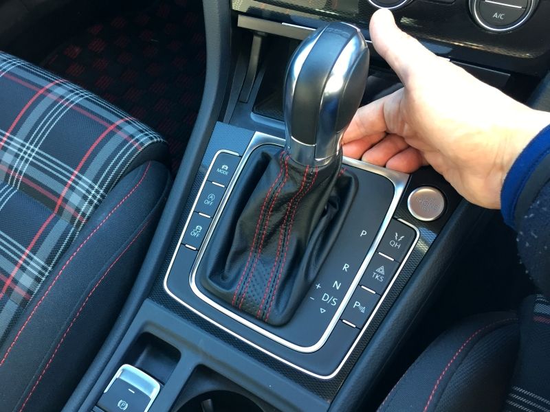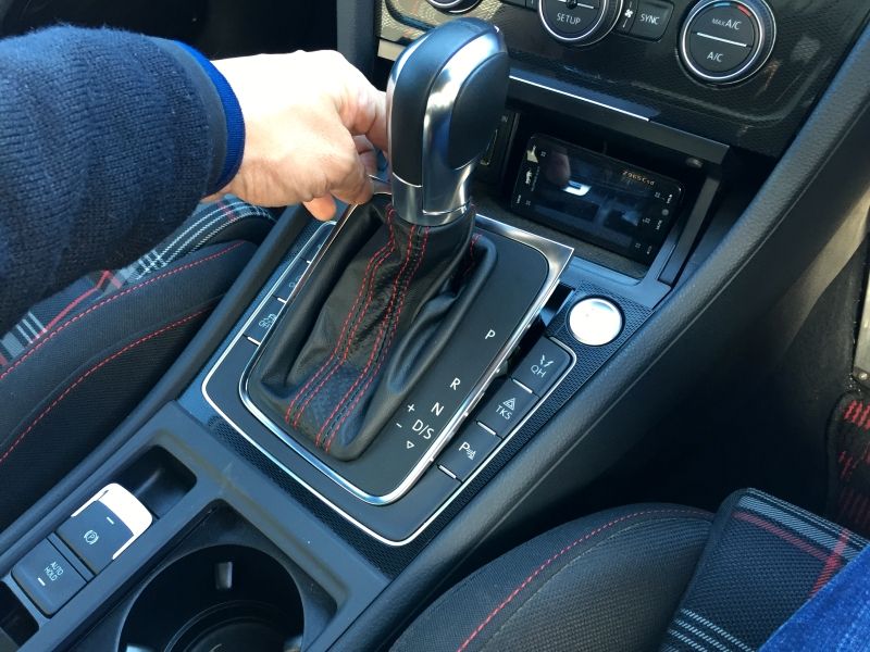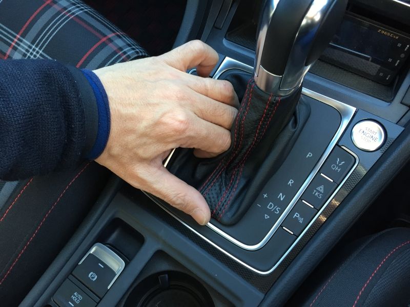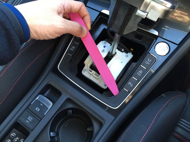 まずシフトノブの周りのカバーを外します。前端付近を単純に上方向に引っ張ると外れます。若干固い場合がありますが、カバーの上部に指を掛けるか、ブーツの内側に手を掛けるなどして前端付近を均等にゆっくりと真上に引っ張ってください。(写真は一人撮影のため片手で作業していますが、実際は両手を使ってください)