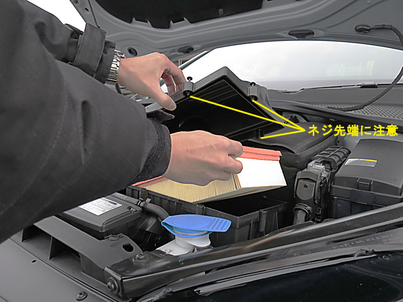 上右写真は、フィルターがちゃんとボックスに収まった状態です。フィルタ周囲のパッキン全体が、この写真のようにエアクリーナーボックスの枠に確実に収まっていることを確認してください。確認したら蓋を元通りにかぶせます。蓋を被せる際にもネジの先端に気をつけて、蓋を正しい位置に被せてください。ネジで締め付ける前に、上蓋全周がきちんとエアクリーナーボックスにかぶさっているかを確認してください。