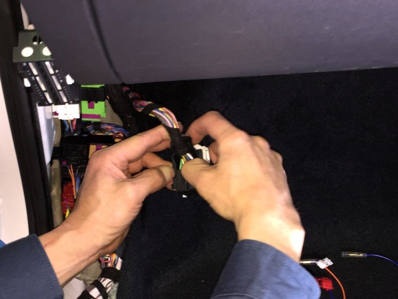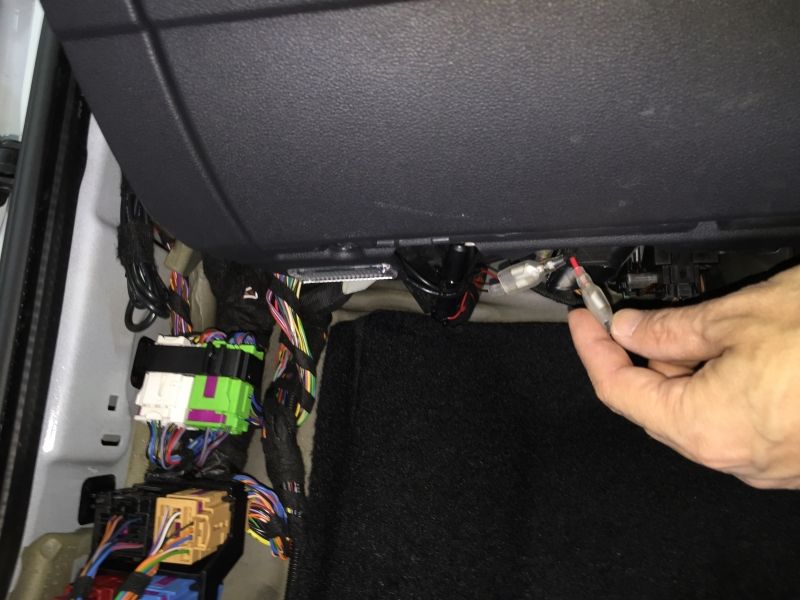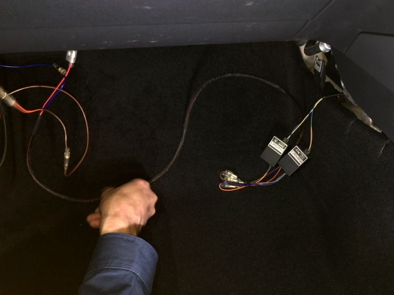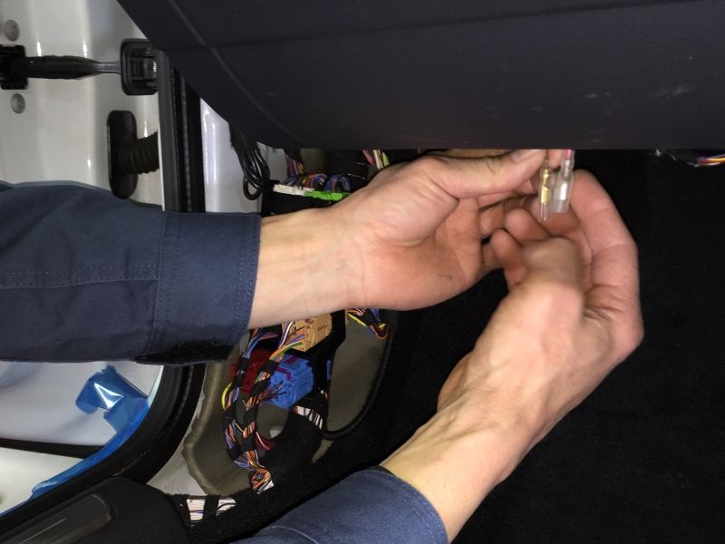 メインハーネスの反対側にクイックホーンモジュールとサンクスブリンカーモジュールを配線色を合わせて接続し、モジュールにmaniacs 4D Console Decorative Switch for Golf7からの配線を接続し、動作テストを行なってください。動作がOKでしたら、メインハーネスとモジュール本体を綺麗に収納して装着完了です。メインハーネスは上中写真のように助手席足下のカーペットの先端を少しめくって、その奥に収容します。maniacsで作業を行なう場合は原則的に念のため車両配線に包縛して固定しますが、通常はカーペットの向こう側に落とし込むだけで十分に綺麗に納まります。あとは、開いたカバー類を全て閉めて完成となります。