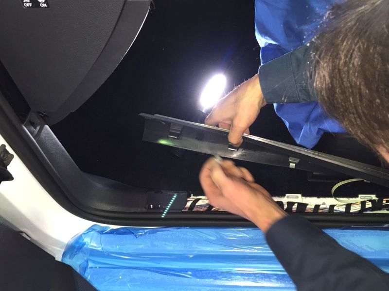 それから、上右写真のようにサイドシルのカバーを外します。完全に外す必要はなく、写真のように前方だけ捲って開きます。サイドシルカバーはクリップで嵌まっているだけですので、上方に引っ張ると外せます。外したあと、カバーの裏面に金属製のクリップが見えますが、作業中に脱落する可能性があるので、このクリップは一旦外して回収しておいた方が安心です。あとでサイドシルカバーを戻す際、その作業の直前にカバーの裏面にクリップを再び装着します。