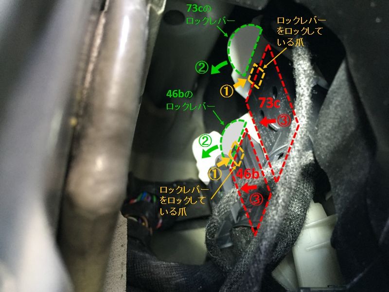 上左写真は、内部を覗いたところです。この写真の見方が少し難しいかもしれませんので、上中写真で説明します。赤枠で囲った黒いプラスチックのものがコネクタ本体です。手前のものが73c、真ん中のものが46bです。奥にもうひとつコネクタが見えますが本作業には関係ありません。赤枠のコネクタ本体の上部に、緑枠で囲った白いプラスチックの部品が見え、これがロックレバーです。ロックレバーの下部にコネクタ本体の一部が下から上方向に四角い爪になっています。黄枠で囲った部分がそれです。この爪は、ロックレバーが開かないように、ロックレバーをロックしています。
