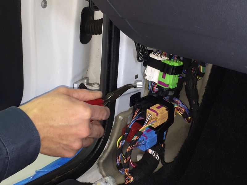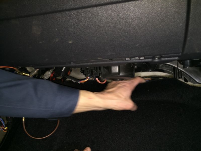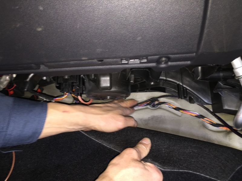 引きだしたアース線は、キックパネル内のコネクタ類を迂回するように、コネクタ類の下方から前方を通して、グローブボックス下に引き回します。引き回した配線の先端は、先ほどの電源線とあとで纏めてタイラップで包縛するので、同じ辺りに来るようにしておいてください。以上で電源線とアース線の準備ができましたので、いよいよ制御線を引き出す作業です。