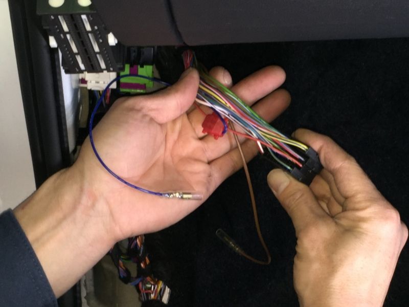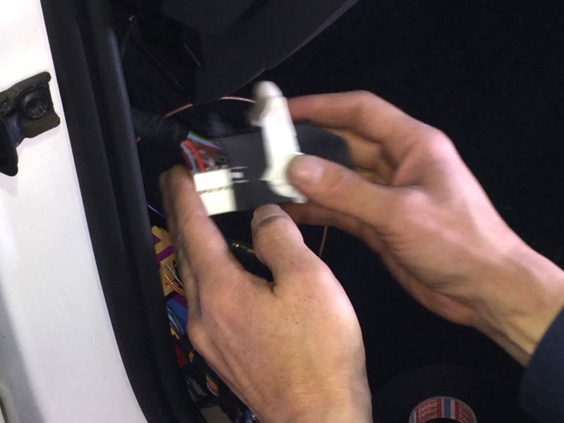 青色制御線をエレクトラタップで接続したら、タップ部分に線の張力が加わらないように配線を包縛して保護し、コネクタを元のように組み立てて、元の位置に接続します。コネクタを元の位置に嵌めるやり方はマニュアルに詳しく説明してあります。コネクタを接続したら、青色制御線の先端(導体)を茶色アース線の先端と一瞬だけ接触させて、ホーンが鳴ることを確認します。長く接触させるとホーンの大きな音が鳴りますので、接触試験をは一瞬だけにするようにしてください。