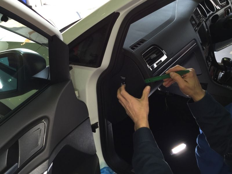 上中写真のように、ダッシュボード左端のカバーとボディの間の縦長の隙間を塞いでいる内装カバーがあり、それを外します。縦長のカバーは嵌まっているだけですが、ドアパッキンの縁ゴムが被っているので、それを捲るようにしながら、縦長の内装カバーを引っ張るとはずせます。それを外したら、先ほどのダッシュボード左端のカバーは、配線に負担が掛からないようにもとの位置に仮装着しておきます。
