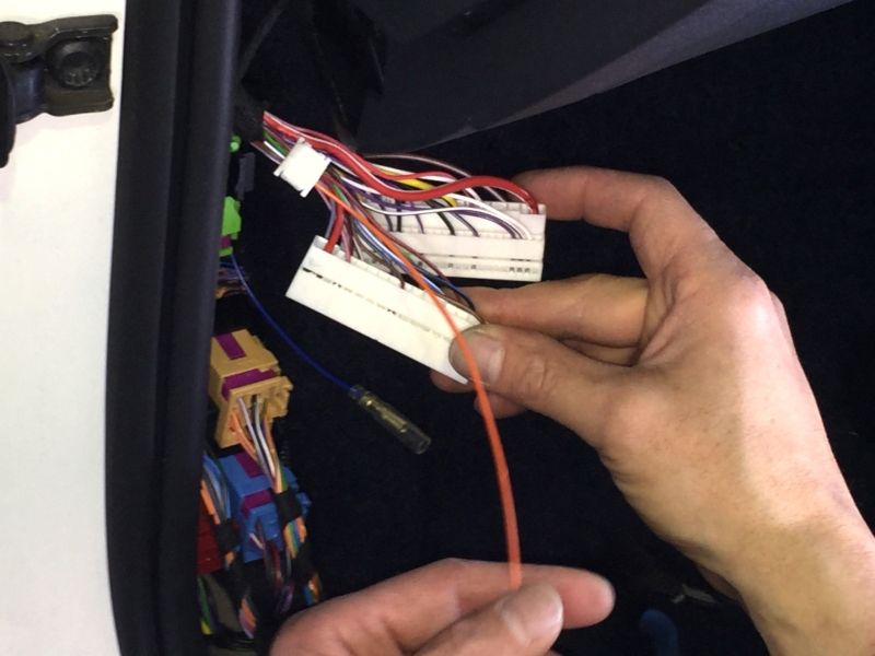 そこまで確認できたら、引き出した4本の配線(赤:電源線、茶:アース線、青:ホーン制御線、橙:ハザード制御線)を専用ハーネスキットのメインハーネスと、それぞれ配線色を合わせて接続してください。ギボシ端子はしっかりと勘合させてください。