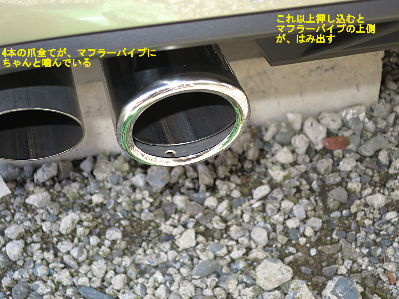 正しく押し込まれた状態です。Golf7の場合、これ以上押し込むと上側のマフラーパイプがマフラーカッターより出っ張ってしまいますので、押し込み状態を何度か確認しながら、徐々にマフラーカッターを押し込んでいってください。繰り返しになりますが、下側2箇所の爪が見えなくなるまで押し込むことがポイントです。
