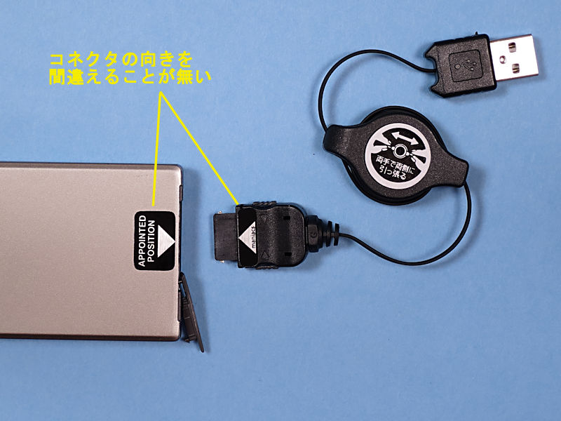 次はコネクタの向き合わせに使用した例です。左写真は会社支給の携帯(本音は持ちたくない。。。)ですが、出張時は荷物を減らすためにパソコンのUSBポートから充電するケーブルを持参しています。ところがこのコネクタ、表裏に差が無いので、毎回差込口を見てコネクタ形状を確認し、差し込む手間が必要でした。そこでコネクタと携帯本体にこのステッカーを貼ったところ、ちょっとしたイライラが解消されて快適になりました。