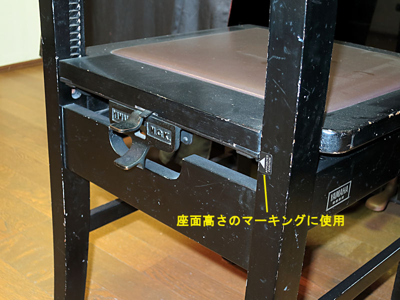 まずはシートつながりと言うことで。上2枚の写真は実家においてあるピアノの椅子です。このピアノ、姪っ子や嫁さんがたまに弾くのですが、誰が前回使ったか判りませんので、座面の高さ調整を毎回行う必要があります。そこで”こっそり”このステッカーを貼っておいたところ、すぐにベストな高さに戻せて便利、と嫁さんから好評でした。また会社で共有する椅子にこっそり貼っておくと、自分だけは簡単にベストポジションにできますね。他にも、一台の自転車を家族で共有している場合は、サドル高さの調整用に便利かもしれません。