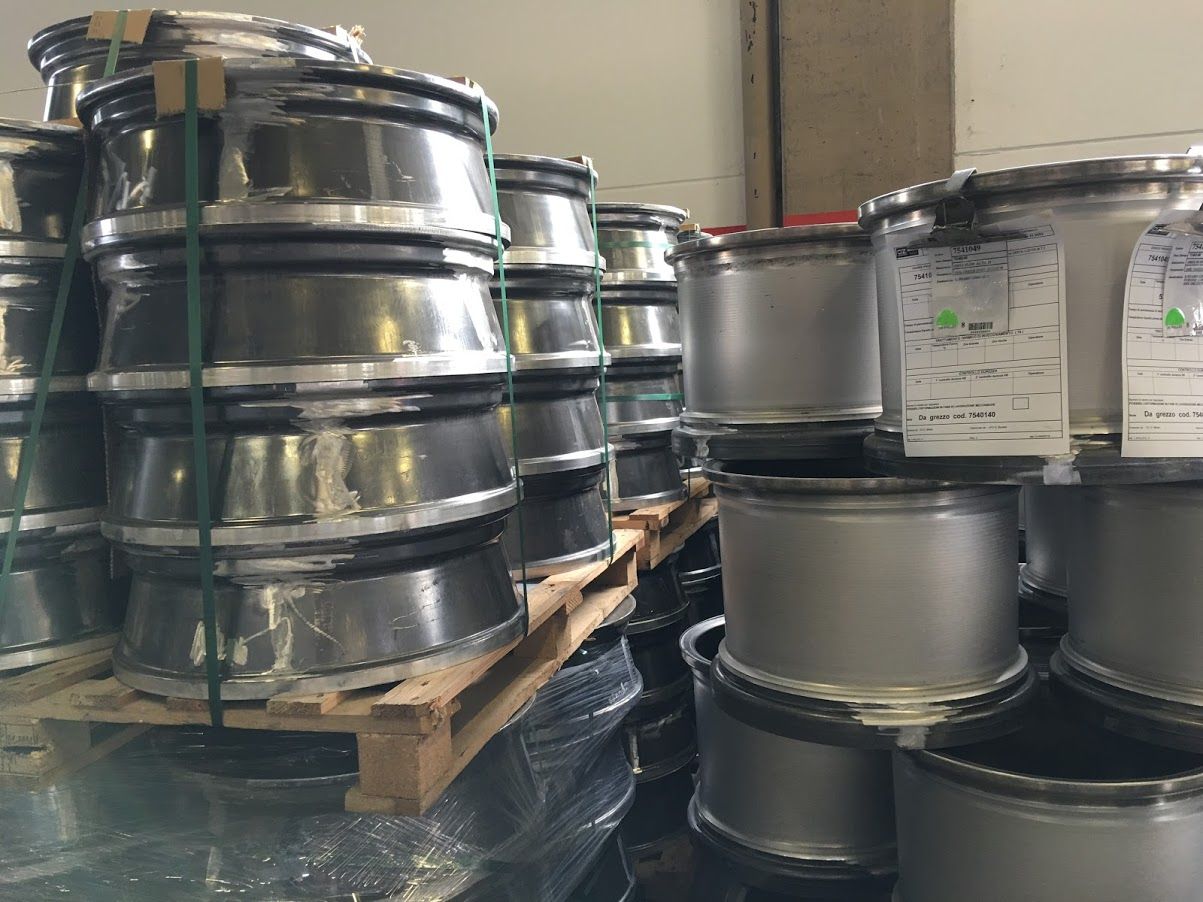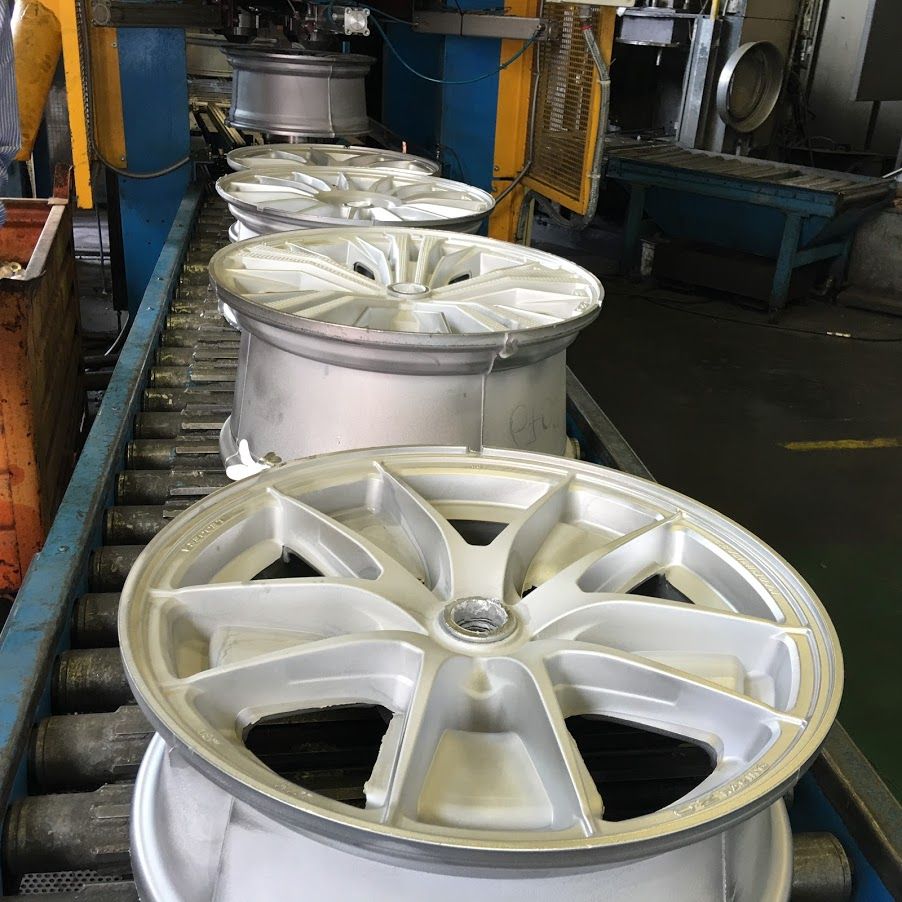 工場のライン見学は、このような感じで各セクション毎に見学者用のプレートがあり、そのプレートで、そのラインで何が行われているかの記載があります。左の写真は、O・ZのHLTという加工工程の部分です。HLT(フローフォーミング)は、鋳造したホイールを回転させながら、ローラーで熱間鍛圧加工して、リム幅の板厚・形状を完成品と同等まで成形する製法のことです。