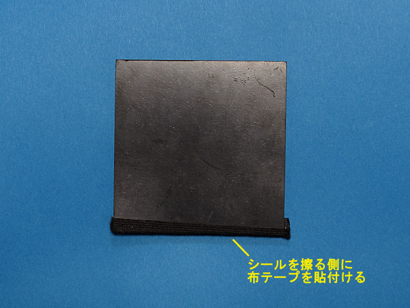 そしてスキージで貼付面の水を押し出していく作業に進みます。スキージは使い慣れたものがあればそれを使ってください。ホームセンター等で購入しても良いです。今回はゴム板をスキージとして代用したのですが、ゴム板やプラ板を使う場合はエッジに布テープを貼ると滑りが良くなり、作業性が劇的に向上します。