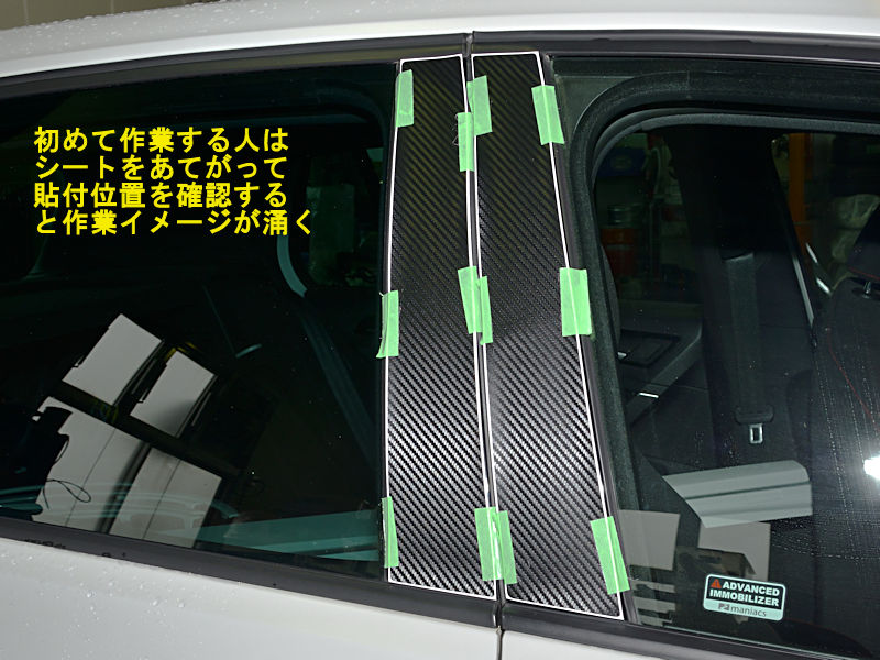 もしさらに具体的に確認したい場合は、左写真のようにシート外形のより少しだけ大きいサイズに剥離紙(台紙)をハサミで切って車両にあてがってみると、どんな感じでシールがピラーに貼付くのかサイズ感や位置関係がイメージできます。剥離紙を切る場合は、シートを切ってしまわないように、またどのシートがどの位置か分からなくならないように注意してください。