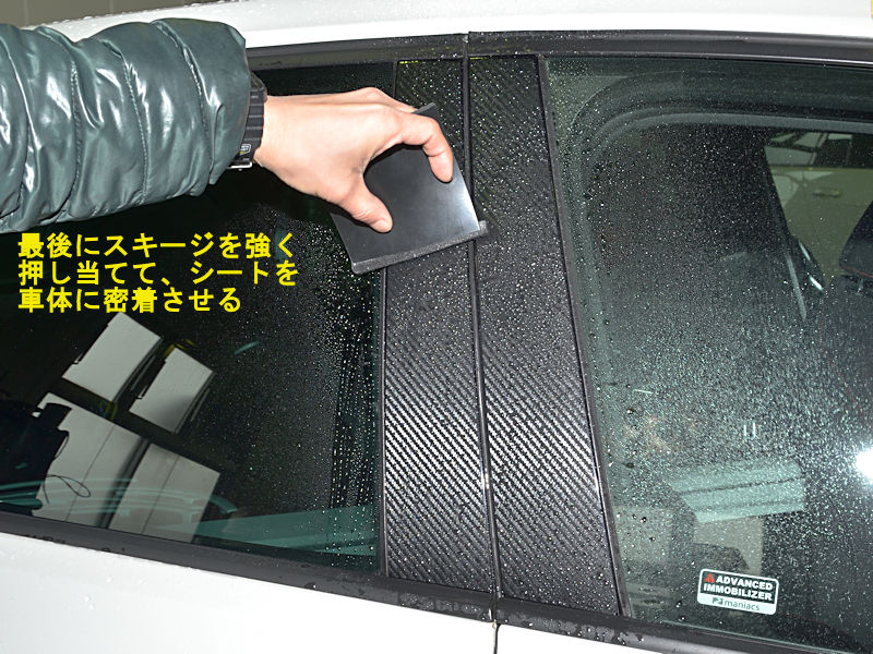 水を完全に押し出してから、最後にスキージを上下にしごくようにして粘着剤を強く押して貼り付けるようにして仕上げます。以上の手順で慎重に作業を行なえば水泡や気泡が残ることはまずありませんが、もし僅かに膨れが残った箇所があっても、小さな水泡、気泡は前述のように時間とともに徐々に抜けていきます。