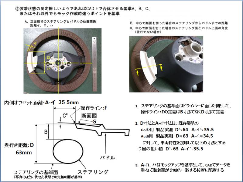 やはり設計者として自分自身が我慢できません(苦笑)。モックアップを作り直し、測定からやり直すことに(っと、これが3月)・・・いつものように紆余曲折を経てとうとう8月になってしまいましたが、さすがに開発は最終段階まで来ており、製品レベルの試作サンプルができあがっています。名称も maniacs DSG paddle extension TSI standardと決まりました。