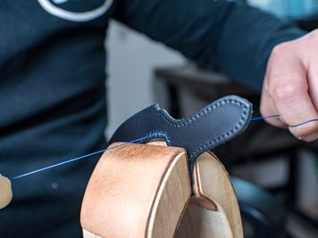 「平縫い」という縫い方で、丈夫な糸を革の表裏から交互にジグザグに通して、一目ずつしっかりテンションを掛けて縫っていきます。平縫いはベーシックであるがゆえに仕事の善し悪しのハッキリ出る縫い方でもあります。革茶屋さんのは縫い目が美しく揃って、堅牢かつとても流麗なステッチです。
