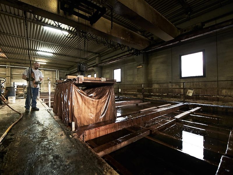 イタリアには、工場を備えた会社から家族経営の小さな工房まで、今でも1000を超えるをタンナーが存在し、その多くがトスカーナ州のフィレンツェから、斜塔で有名なピサへ流れるアルノ川の周辺にあります。この地方に伝統として受け継がれる植物タンニンなめしと加脂の革作りを「バルケッタ製法」と言いますが、これは決まった製法、決まったレシピを意味するのではなく、その地方で行われている技法の総称です。タンナーによって、タンニンに用いる植物も浸し方も異なり、オイル(植物油、獣脂、少量の鉱物油も配合する)のレシピと含浸量も異なります。その多くは門外不出に守られているため、じつはバルケッタ製法は具体的な製法で定義されているわけではないのです。