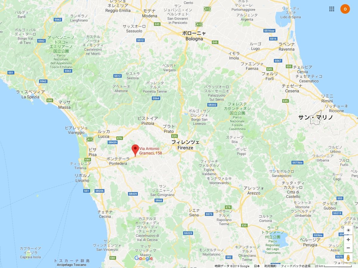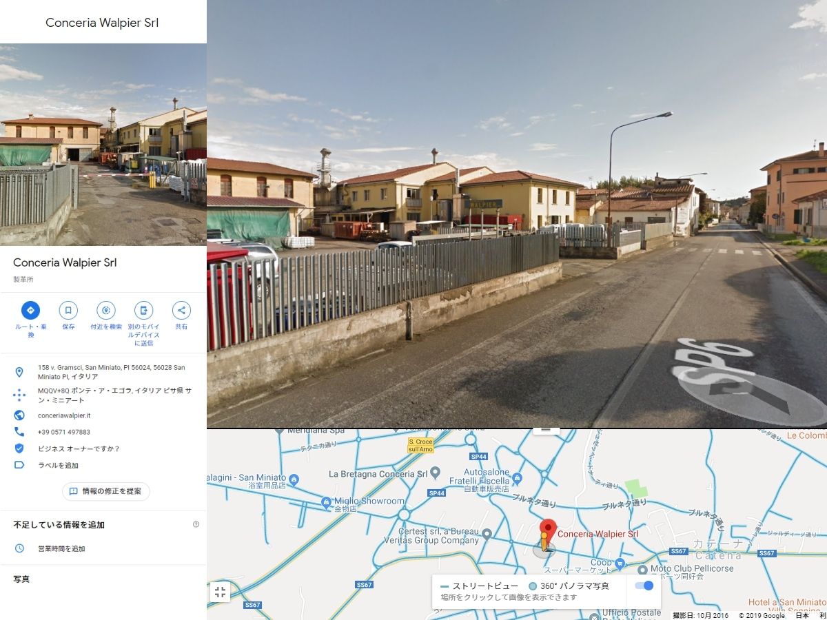 銘革を作るタンナーの多くはトスカーナ地方の中でもサンタクローチェ、サンミニアート界隈に集まっています。左写真はコンソーシアムの公式サイトからワルピエ社をGoogleMapで表示したものです。サンミニアートの東寄り、のどかな風景の道の左側にWALPIERの看板が見えます。ワルピエ社は1973年に腕利きのタン職人が創業したタンナーで、創業から一貫してその子孫が受け継ぎ家族経営を守っています。写真のとおり小ぢんまりとした工房です。