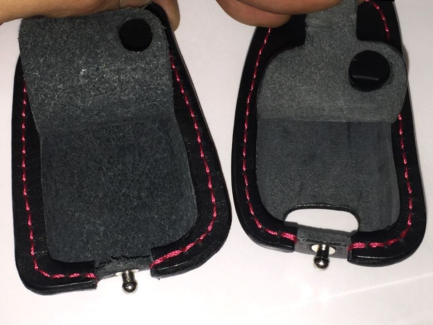 そして、早速革茶屋さんが作ってくださった一次試作を、栃木レザーの0次試作と比較してみました(一次試作はAudi用、0次のVW用とは異なる形状です)。写真では上手く伝わらないかもしれませんが、革の印象が全く異なることに驚きました。