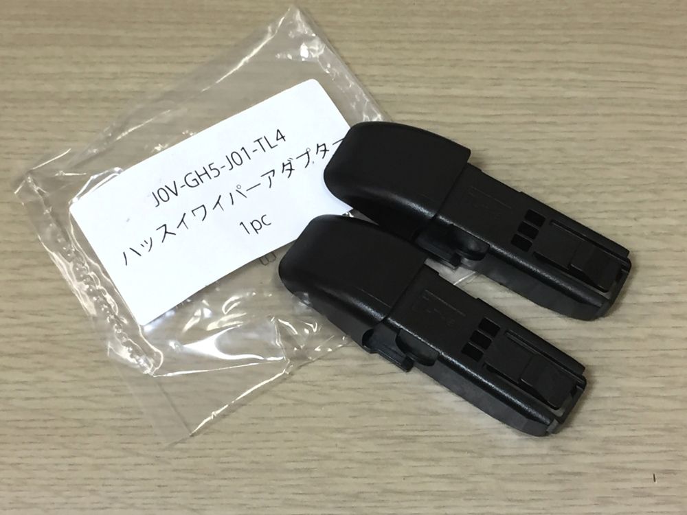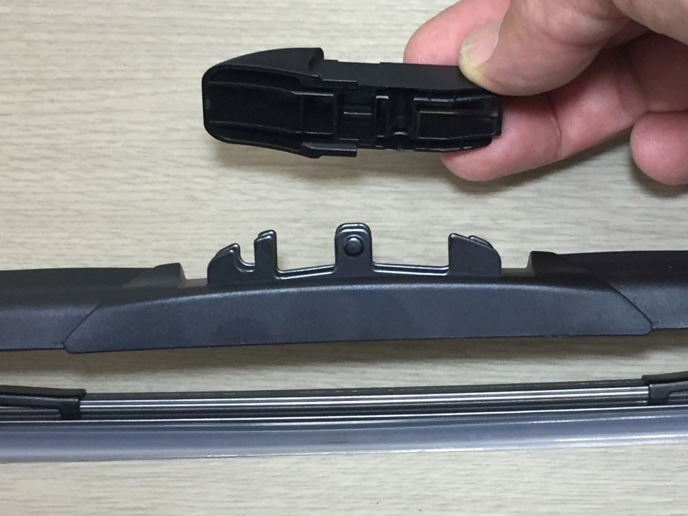 外観はフラットワイパーと概ね似た感じですが、a)本国純正ワイパーと並べて比較した場合はセンター付近に若干の太さがあります。ビビリ防止という意味ではフラットワイパーよりもコンベンショナルなトーナメント機構に一日の長がありますので「とにかくビビリを止めたい」という目的には有効な選択肢です。販売は1本単位ですので、L/Rそれぞれ適合の長さのものをお買い求めいただき、かつ別売りの専用アダプター(2個=1セット)をご購入いただく必要があります。装着は、先にアダプターをアーム側に嵌め込んでセットして、あとはブレードをパチンと嵌めるだけです。