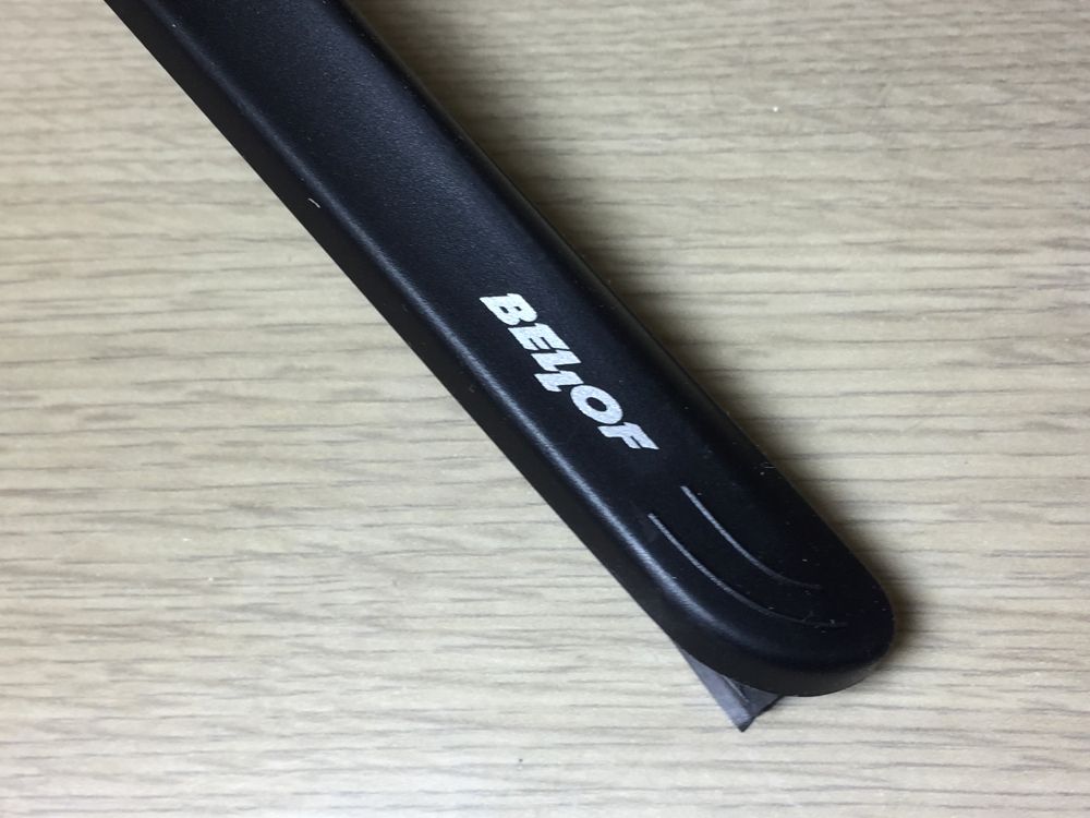 ブレードの構造は(名称はフラットワイパーとなっていますが)、分類的にはエアロデザインワイパーに該当すると思います。スチール製のクランプでゴムを保持し、そのクランプのシーソー機構はトーナメント式に4-2-1と集合されるのではなく、湾曲した弾力のあるフレームに並列的に固定されています。通常のエアロデザインワイパー(←トーナメントワイパーとフラットワイパーの中間的)よりもフラットワイパーに近い独特の構造で、クランプの数が多いのも特徴です。その全体がエアロシェイプのカバーに覆われており、a)本国純正、d)BOSCHと見比べると中央付近がやや太いですが、全体には比較的スッキリした外観になっています。端部にはBELLOFのロゴがあります。