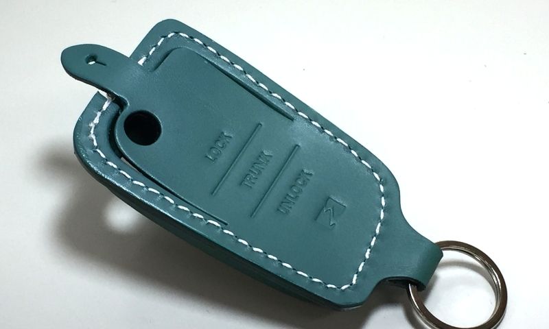 こちらは「ターコイズ革×白糸」です。明るい革色に純白のステッチが良く映えます。爽やかな色合わせは高貴な印象で、革の温もり感と調和しています。