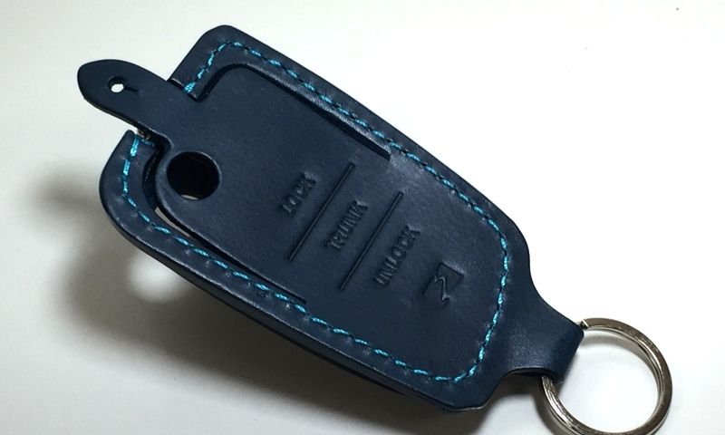 最後にご紹介しますのは、Type-E(Passat, Arteon用)の「青革×シルバー糸」です。同じ色合わせでも形状が異なるとまた印象が違ってきますね。シルバーのダークなステッチは控えめなコントラストで、少しだけコンパクトなType-Eのシェイプが革の青色をさらにキュッと引き締めている印象です。