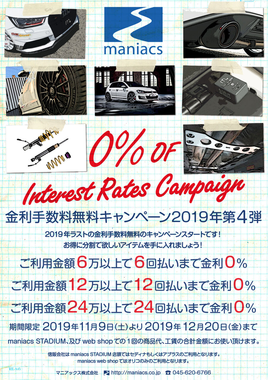 2019年11月08日 【スタッフ日誌】2019年ラストの金利手数料無料キャンペーンは11月9日よりスタート maniacs遠藤です2019年第4弾ショッピングローン金利手数料無料キャンペーンが、maniacs STADIUM、maniacs web shopともに11月9日(土)午前9時からスタートいたします。2019年ラストの金利手数料無料キャンペーンは、期間12月20日(金)までになっておりますので、是非このチャンスをお見逃しなく!! タグ :#金利手数料無料#キャンペーン#マフラー#ホイール 「スタッフ日誌」カテゴリの最新記事 < 前の記事次の記事 >