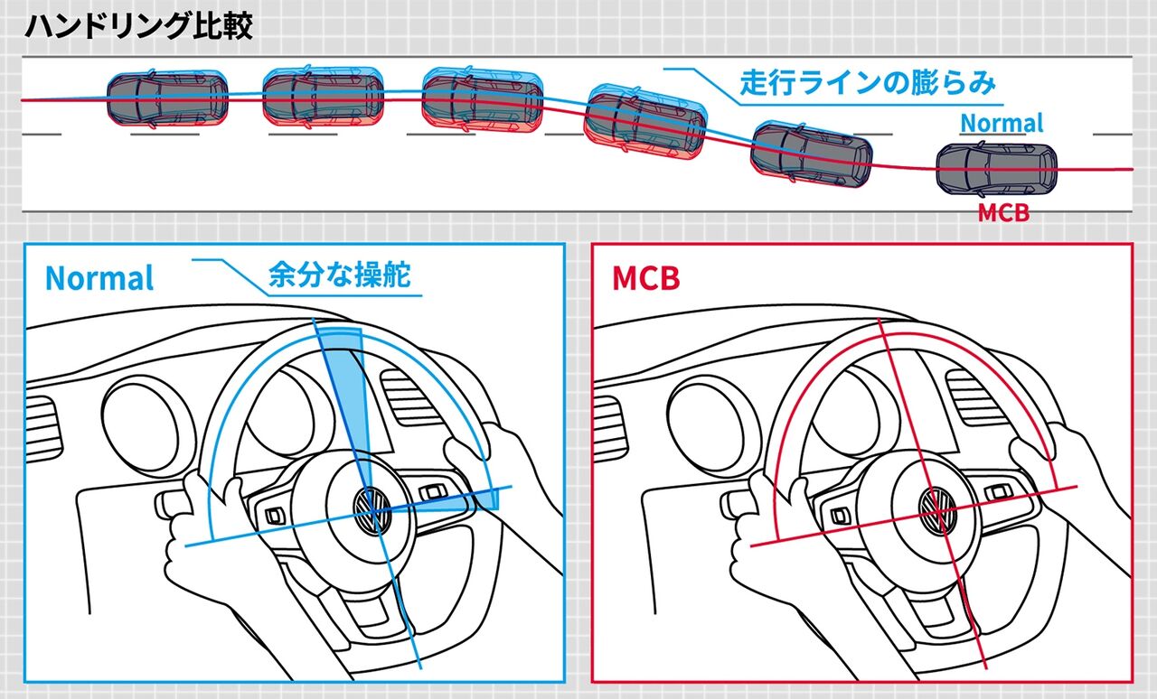 MCBはそれらの優れた特性により、車両の挙動を安定させ、ステアフィールからも不要なノイズ成分を取り除いて雑味のないスッキリとしたインフォメーションをもたらします(ノイズは「音」の意味ではなく「主情報を阻害する余計な情報」のこと)。操舵のアンダーシュート/オーバーシュートを低減することでより自然な操舵感が得られ、ライントレース性を向上します。