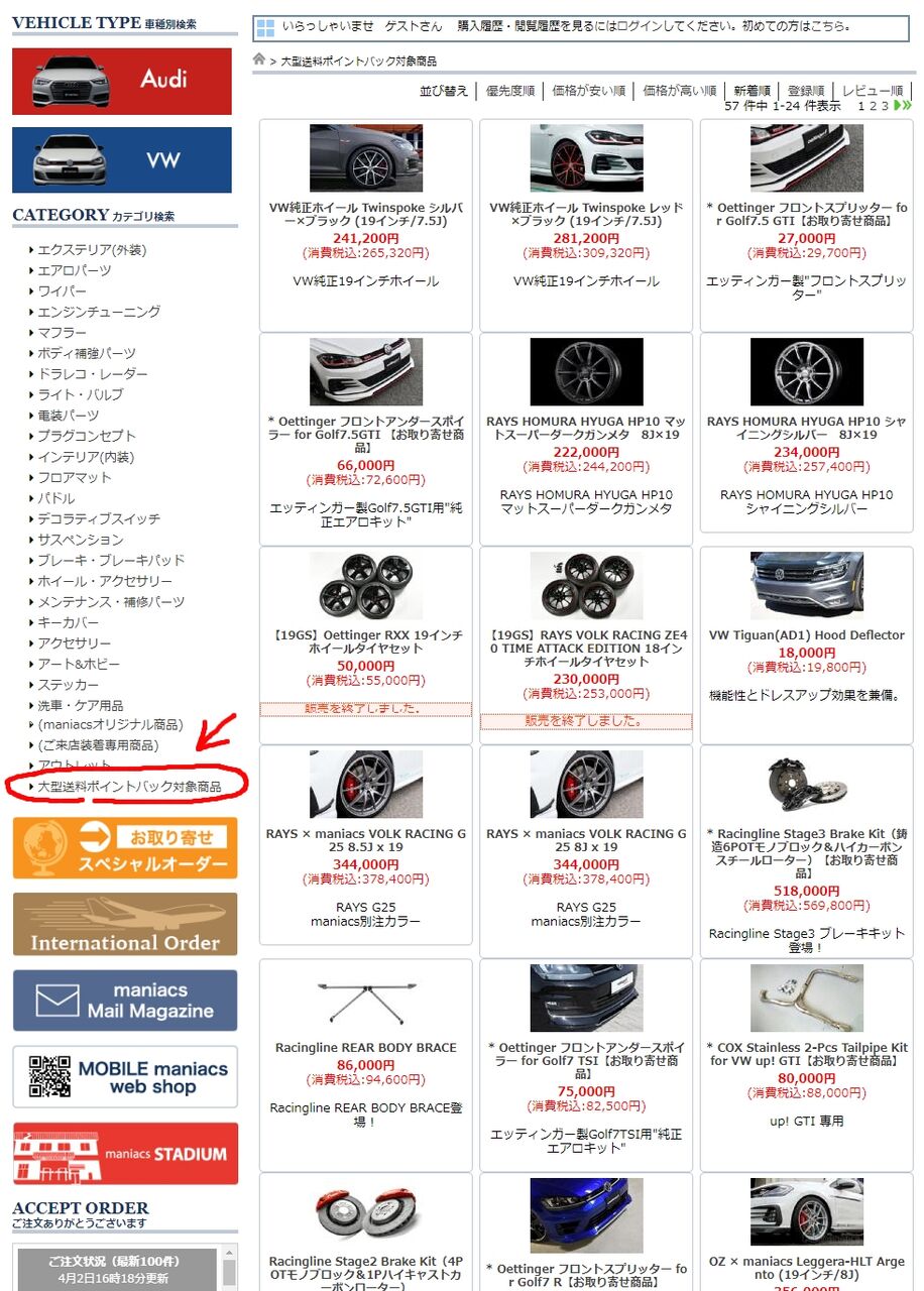 左のカテゴリー一覧の一番下、「大型送料ポイントバック対象商品」を押してください。対象商品が一覧で表示できます。全57品目あり、1ページに表示しきれていませんので、下までスクロールしたらその下右の1,2,3>>という表示をクリックしますと次のページが表示されます。