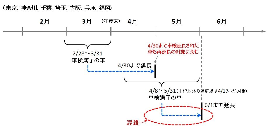 2月末の公示と4月の公示で2段階の延長措置となっており、かつ4月の公示は7都府県とそれ以外の道府県で時期が違って複雑ですが、現時点に至っては概ね全国一律の内容です。(4月8〜16日が満了日の車だけ7都府県と他道府県で扱いが異なります、詳細は国土交通省のページをご覧ください)要点は、