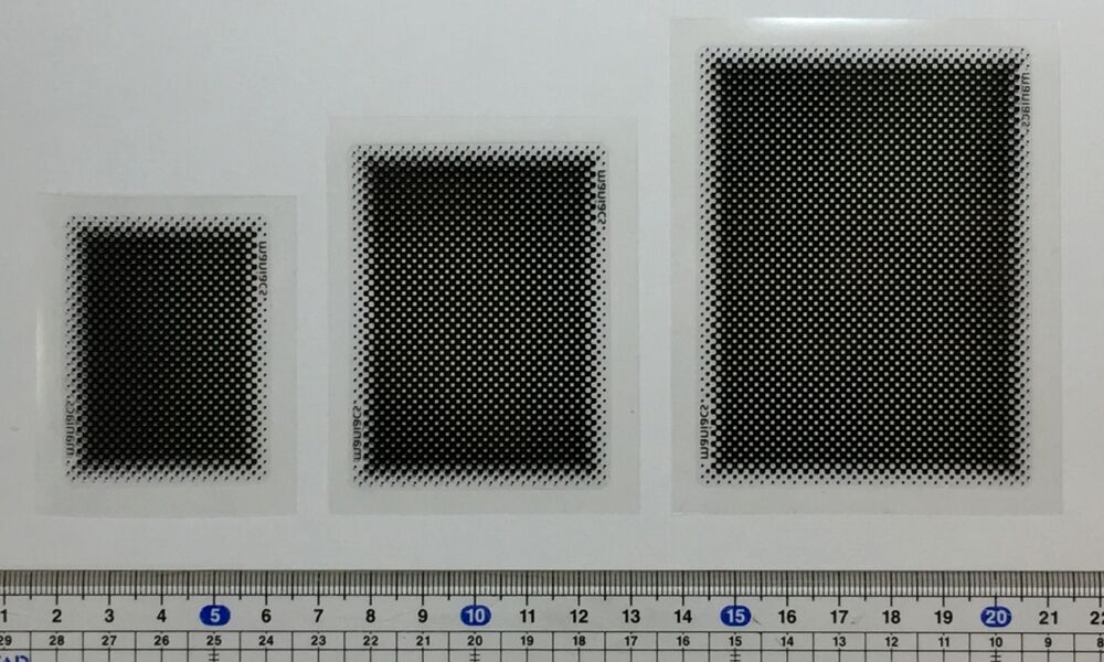 この吸着作用(=台座面積に掛る大気圧)はSサイズのドットグラデーションシールでも約10kgになります。粘着シールは一般的には常時重さが掛るような使われ方が苦手ですが、にもかかわらず「心配ありません」と言い切れるのは、シールの粘着剤が強力だからではなく、機器の重さ(=60〜150g程度)をおよそ2桁上回る吸着作用のお陰なのです。