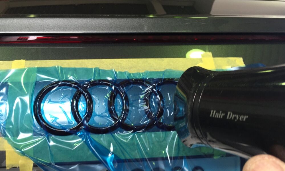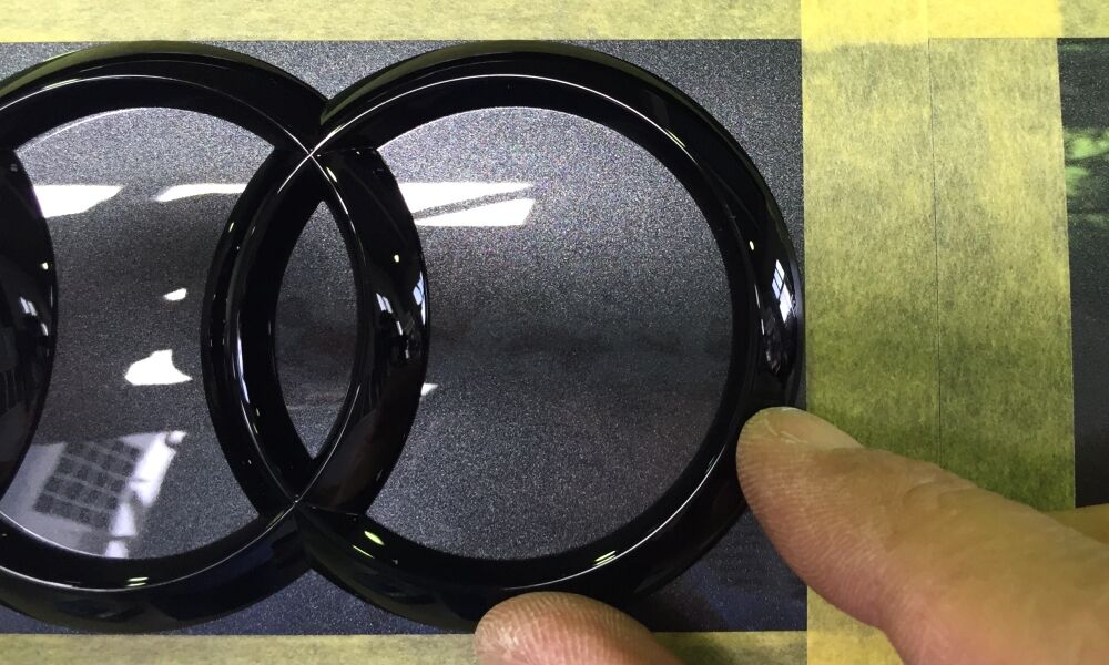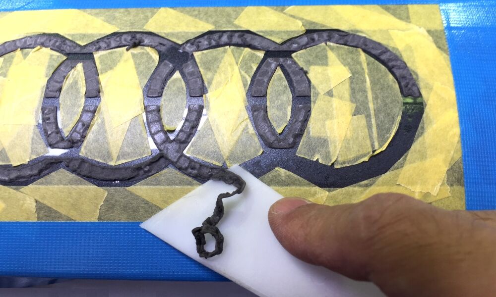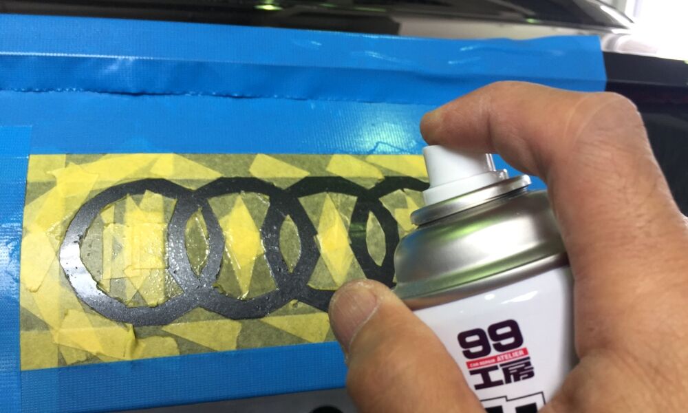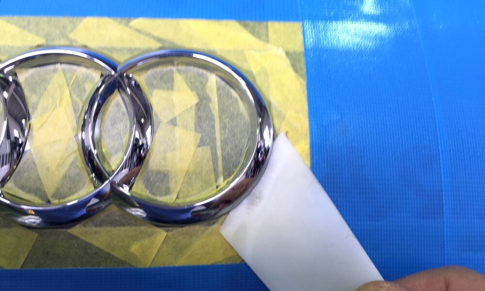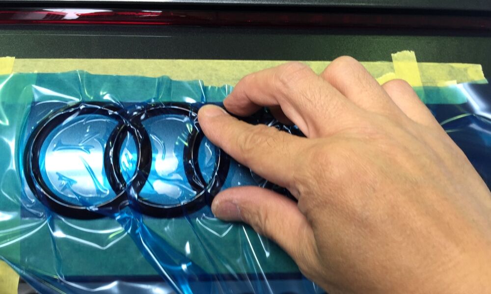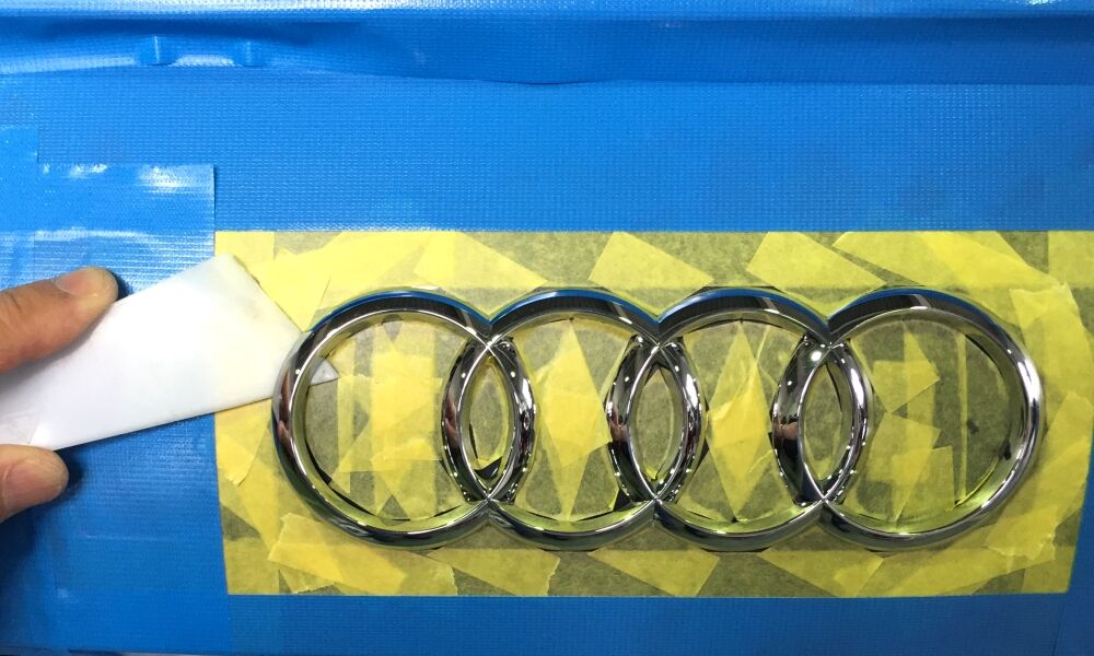 マスキングを完了したら、ノーマルのエンブレムを取り外します。糸で切り取る方法もありますが、Audiのエンブレムにはその方法が不向きです。理由は、通常の(他メーカの車両の)エンブレムは両面テープの厚み分だけボディ面から浮いて装着されている場合が多いのに対して、Audiのエンブレムは両面テープの厚みをエンブレムの裏面形状で吸収して、エンブレムの周囲とボディ塗装面との隙間が非常に僅かしかないからです(糸1本の太さの隙間がありません)。
