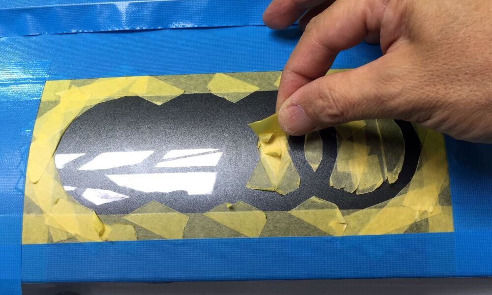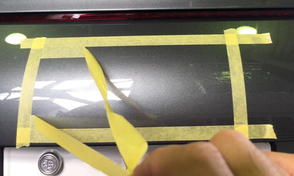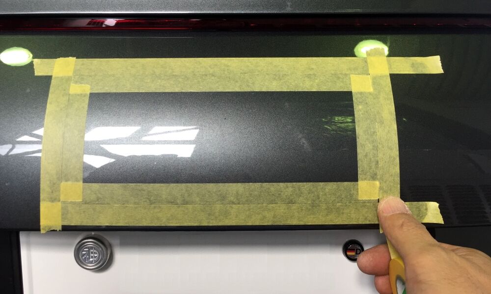 修正する場合は、修正分を見込んだ位置にテープを貼り直しますが、この車両はピッタリまっすぐでしたので、ノーマルの位置のとおりを踏襲すればOKです。位置決め外枠長方形を決めたら、エンブレムだけを残してボディ面をマスキングします。これは傷防止の養生のためなので、エンブレムの外形(縁)が微妙に浮いている下にまですべり込ませて、できるだけ内々まで貼り込みます。