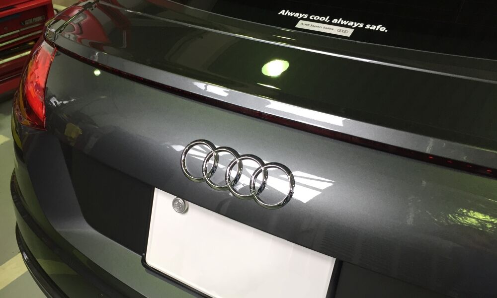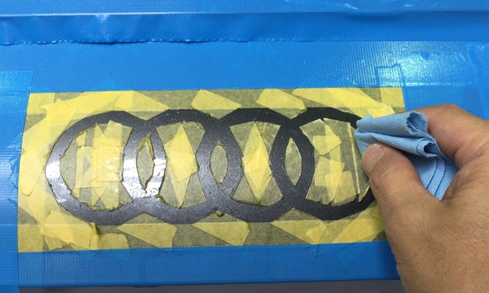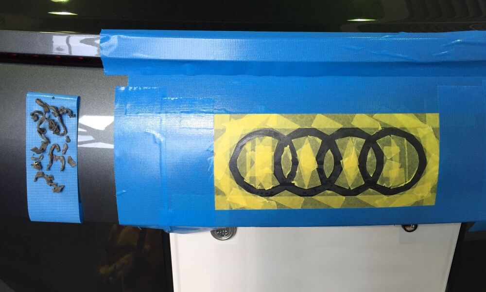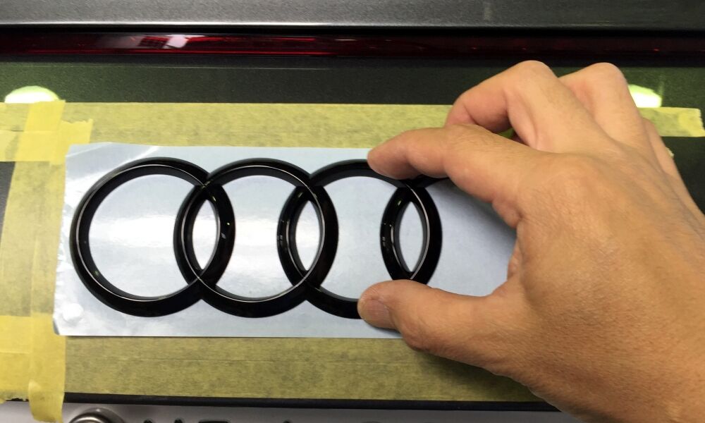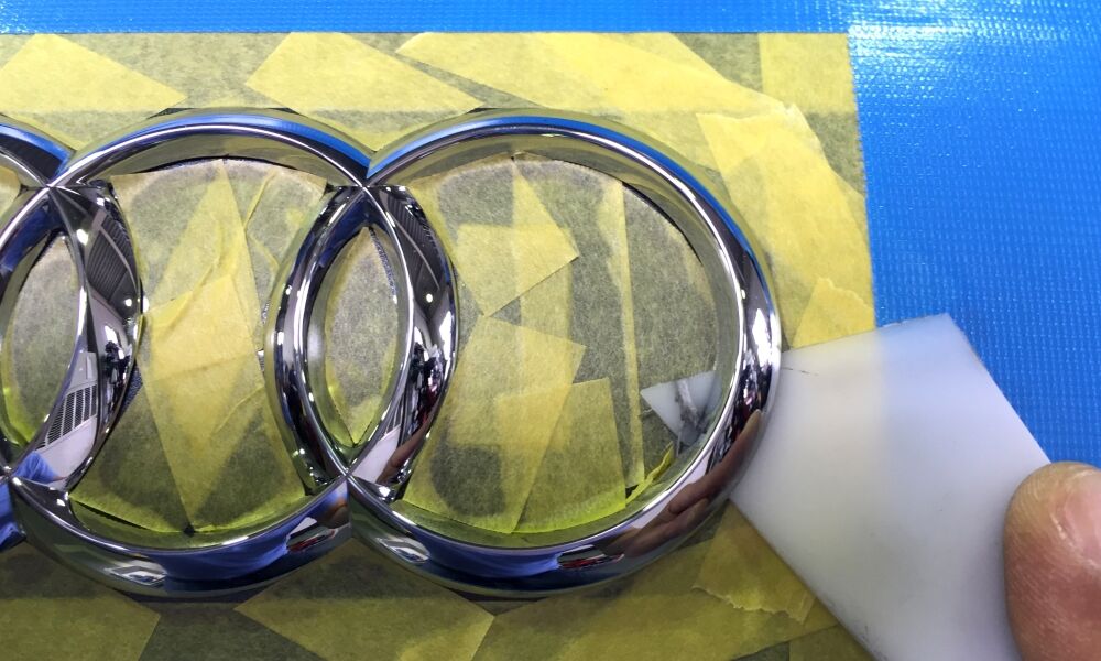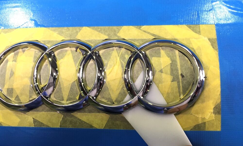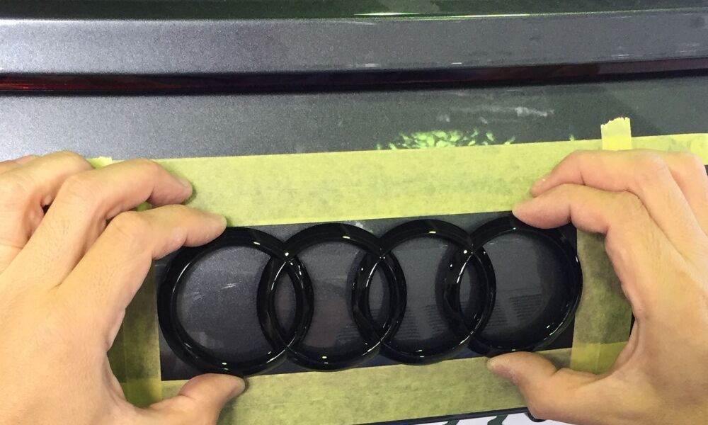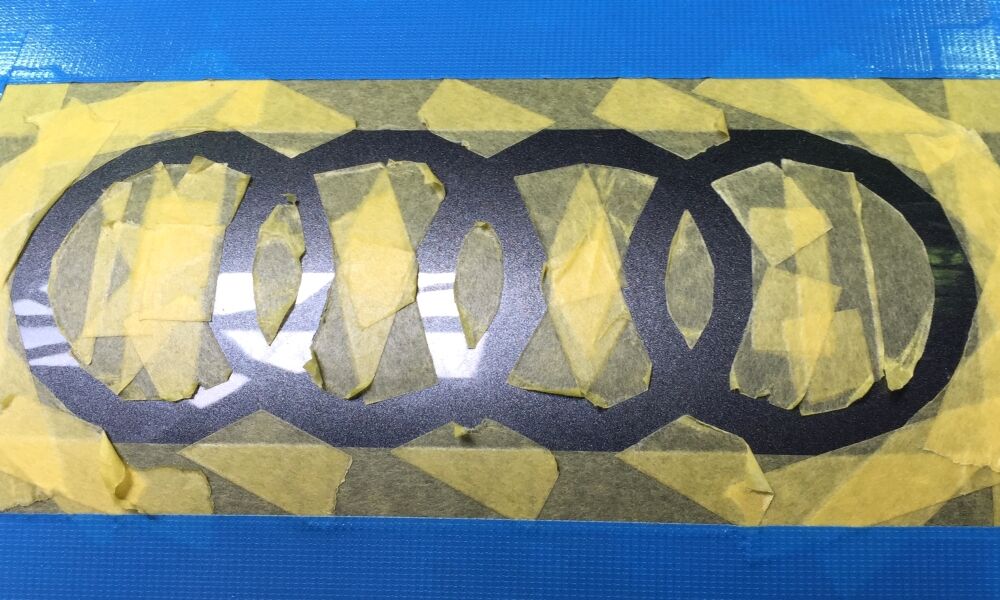 この施工例は、TTです。ノーマル状態ではクロームメッキの4Ringsエンブレムが装着されています。ブラックに換装する場合、もともと装着されているメッキの4Ringsと寸分違わぬ位置に貼ることが基本です。なので、作業の最初にまずノーマルのエンブレムの外形をマスキングテープで囲って位置をマークします。