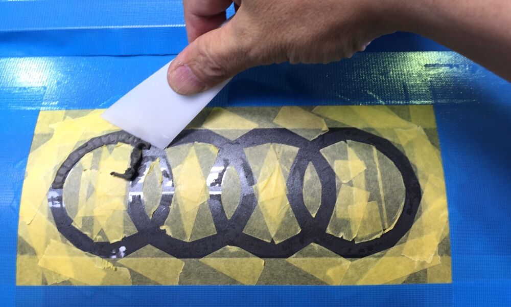 先端を研いだプラスチックスクレーパーをエンブレムとボディ面のマスキングテープの間に差し入れます。最初はスクレーパーの刃幅の真ん中辺りから差し入れるのが入れ易く、きっかけができたら刃先の尖った部分を使うようにします。先端が4Ringsの輪の内側に突き出す際は、その先端が輪の中のマスキングテープの下に潜り込まないように、必ずテープの上に出てくるようにします。