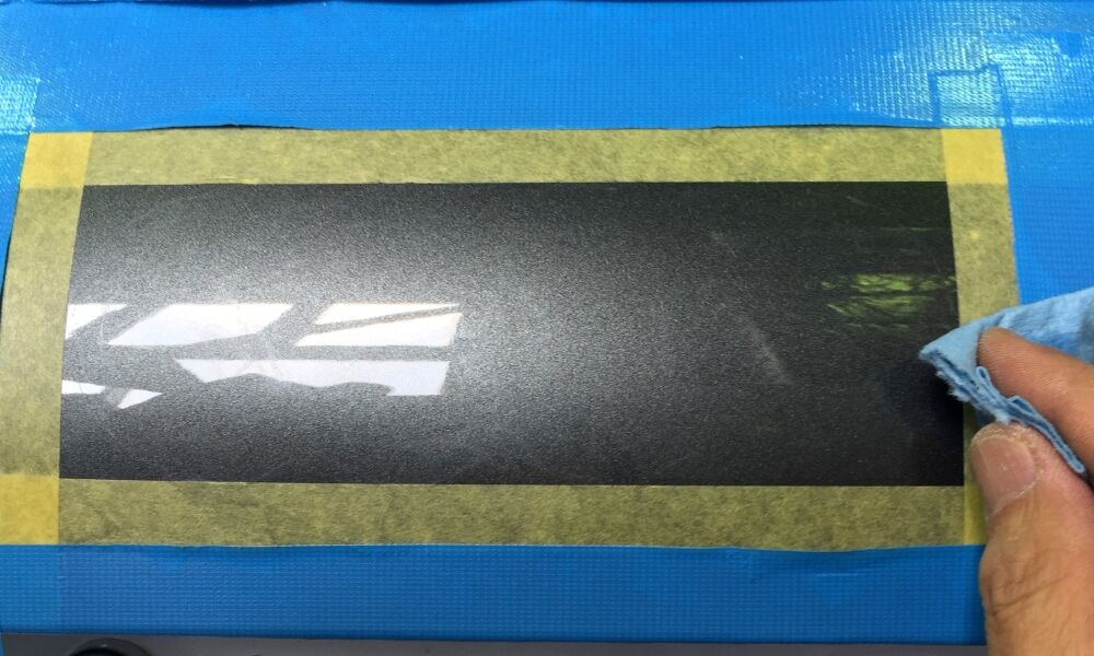 車両によってはエンブレムの下に泥汚れや細かな砂粒が詰まっていたりします。この車両の場合はとてもに綺麗な状態でしたが、こんなに綺麗な状態の車両は珍しいです。大抵の車両では、両面テープの縁に土埃のような汚れが溜まっています。汚れている場合はこの段階で一旦濡れ雑巾等で良く拭いて、水溶性の汚れをできる限り除去してから次の工程に進みます。汚れたまま作業するとボディに傷をつける原因になります。