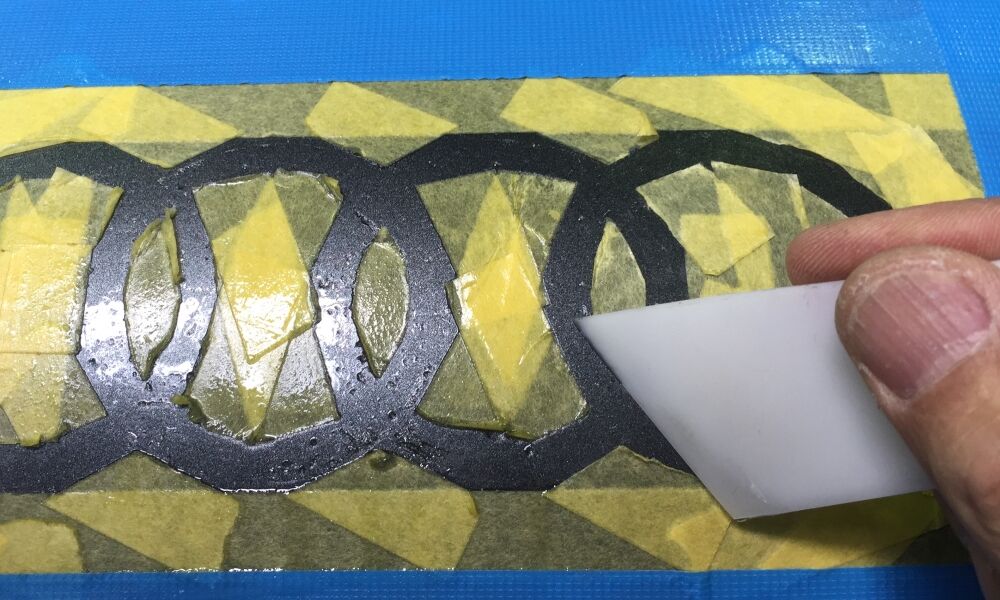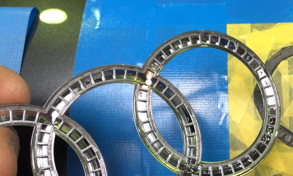 この段階ではテープを切ることが目的なので、くれぐれもエンブレムを引き剥がす方向にコジッたりしてはいけません。先に、4Rings全体の外周をぐるっと一周全部切り終えてから、中ほど3個所の輪と輪が交わったた部分の両面テープを切ります。その際は、どうしてもスクレーパーの手元側、厚みのある部分がエンブレムとボディの間に差し込まれることになりますが、極力エンブレムを浮かさないように、コジって剥がす方向の力が掛らないように注意します。