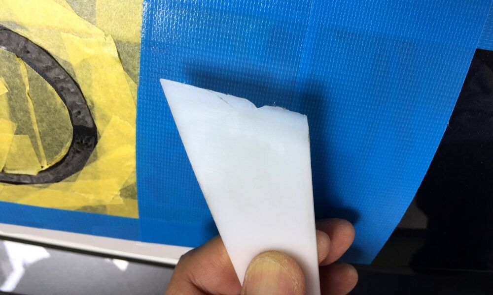 あとは、良く押しつけて定着させる必要があります。ブラックエンブレムはグロス仕上げなので手指等でゴシゴシ触ると傷っぽくなります。なので、お客様の車両に施工する場合はマスカーで養生をしてその上から押さえます。ヘアドライヤーで熱を掛けつつ抑えることで、より完全に定着します。しっかり着いたら、マスカーと位置合わせのマスキングテープを全部剥がし、ボディ面の指紋やテープ類の跡をスピードシャイン等でクリーニングして完成です。