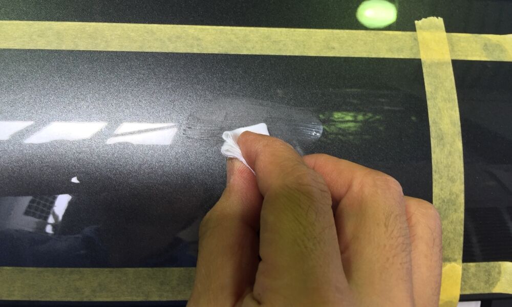 粘着剤が汚れやカルキと一体になって固まっている場合は、シリコンオフではなかなか溶けず、除去できない場合もあります。ウェスなどでしつこく擦っていると、やっているうちに無意識に擦る力が強くなってきて傷になるリスクが増すので、どうしても除去しづらい場合は(車両の塗装に修復歴がなければ)思い切ってラッカー薄め液(=ラッカーシンナー:シリコンオフよりも溶解力の高い溶剤です)を使った方が良い場合もあります。そのあたりの判断は状態によってケースバイケースです。